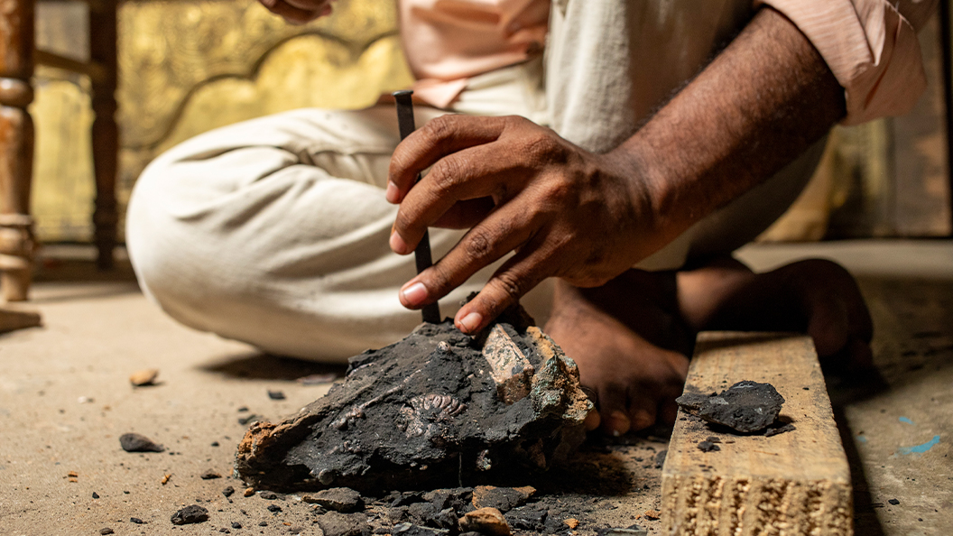 The process of bronze casting begins on the riverbanks, from where clay is collected for the statues. Then, the sthapathis use the "lost wax" method to cast these artefacts. They shape resin, paraffin wax and groundnut oil into a model that forms the foundation of the mould. Next, they heat and drain the mould, and fill it with metal. Ghana (solid casting) and sushira (hollow casting) are two traditional techniques for replacing the wax at the core. Using these techniques, sthapathis can craft figurines from 6 inches to a towering 12 feet in height. Once the figurines are cast, they are washed with tamarind and soap nut water, and polished till they gleam. The completed figurines are then sent to their new homes, blessed by Lord Murugun himself.