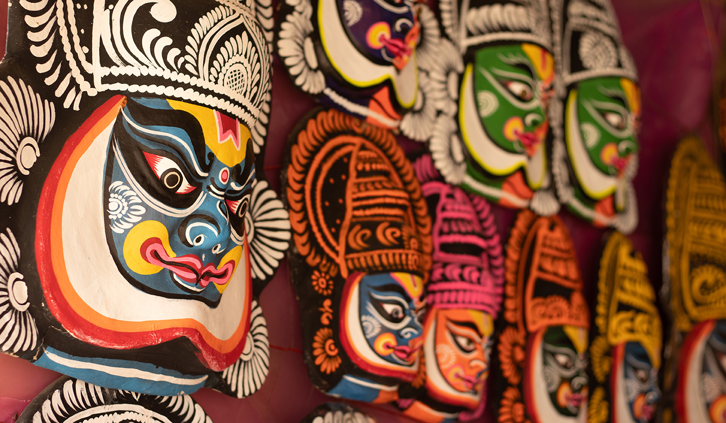 These masks portray a dazzling array of animals, demons, and deities, with unique expressions. They are worn with shimmering costumes mainly for the Chhau dance. This dance form narrates folk and tribal stories or martial-art tales, borrowing from mythology and reality. Wearing these masks symbolise the mythical change inside human beings, into super humans who vanquish evil.