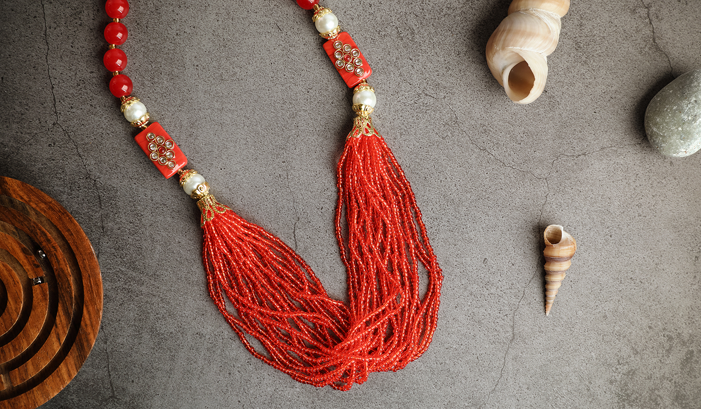 In India, bead work is believed to have evolved as a craft after embroidery, approximately 5000 years ago. They were valuable possessions and were often used as currency by local people to purchase different goods. Because they held such high value, the tribal community would string them together and wear it around their neck to ensure its safety.