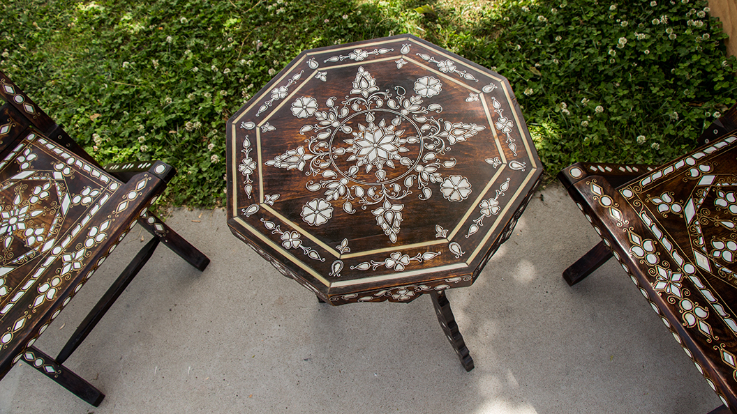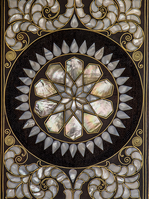 The iridescent quality of mother of pearl, found inside mollusc shells like oysters, mussels, abalone, and snails, makes it popular for decorating furniture and jewellery. Since the shells are delicate, it takes artisanal understanding and expertise to cut and shape them into desired forms. In India, artisans from Rajasthan and Gujarat practice this craft.