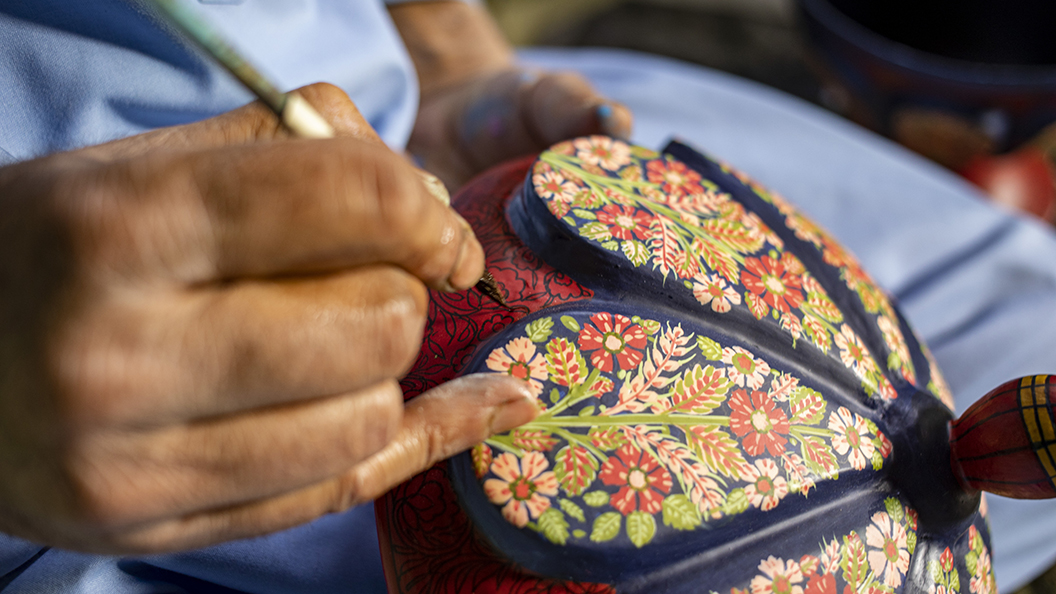 The creation of papier-mâché artefacts involves two steps. The first, sakhtsazi to make the base with recycled paper that has been soaked and mashed to pulp. Then, naqashi, completing the artwork with painting and ornamentation.