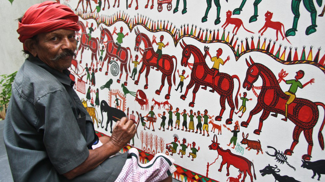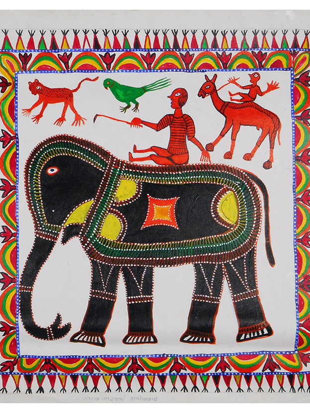 Pithora is a form of ritualistic wall painting by the Rathwa, Bhils, Nayak and Tadi tribes. The name, Pithora, refers to the Hindu deity of marriage, and the art is popular in Gujarat, Rajasthan and Madhya Pradesh. Each Pithora painting is unique, as the artist leaves distinct marks to signify his intellectual and creative rights. It's a folkloric way of copyrighting designs. These paintings are believed to go back a few thousand years, derived from the cave paintings at a local hilltop near koraj-i-dungar.