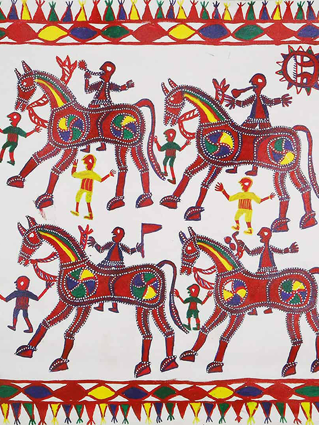 For people from the Rathwa tribe, Pithora is not merely a painting but a medium to express their faith, culture and history. Baba Pithora is one of the main deities worshipped by the Rathwa community, and these paintings are a form of devotional appeasement. These drawings appear on three walls inside the homes of Rathwa, especially in the main threshold of the house. The process of painting is part of a ritual to invoke peace, prosperity, and removal of obstacles from the lives of a particular family. Typically, there are two varieties of Pithora, depending on nature of marital vows and the finances of the family. There’s the Ardho Pithoro (half Pithora) and the Akho Pithoro (complete Pithora). They are also drawn on walls as a form of superstitious intervention if the cattle in the rural house is unyielding or if the children are unwell. In the former, five to nine horses are drawn with only having a rider, while in the latter, there are a total of 18 horses with their celestial riders.