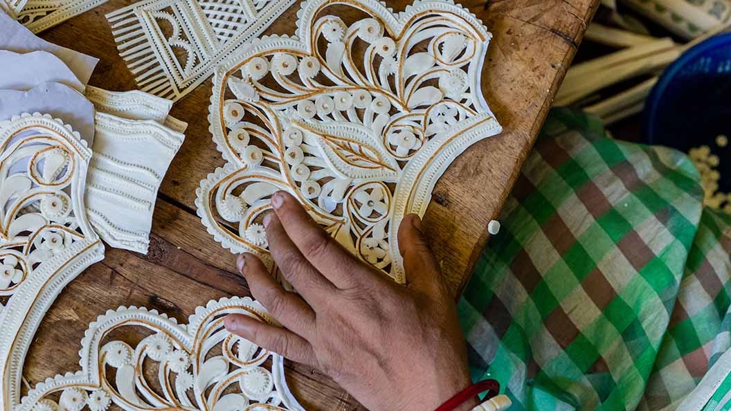 Sholapith art has interesting mention in Bengali folklore. The tale goes that Lord Shiva beseeched Lord Vishwakarma, the god of architecture and creative prowess to make a white crown for his nuptials to Goddess Parvati. When Lord Vishwakarma faced challenges, Lord Shiva then created a human form named Malakar . He entrusted him with the task of creating the headgear, garlands, and other accessories. Now, the Malakar community still revere Lord Shiva. They believe their existence to be a manifestation of his blessings.