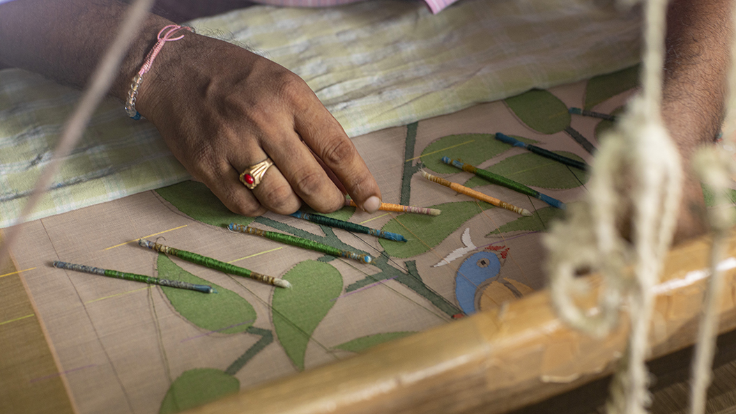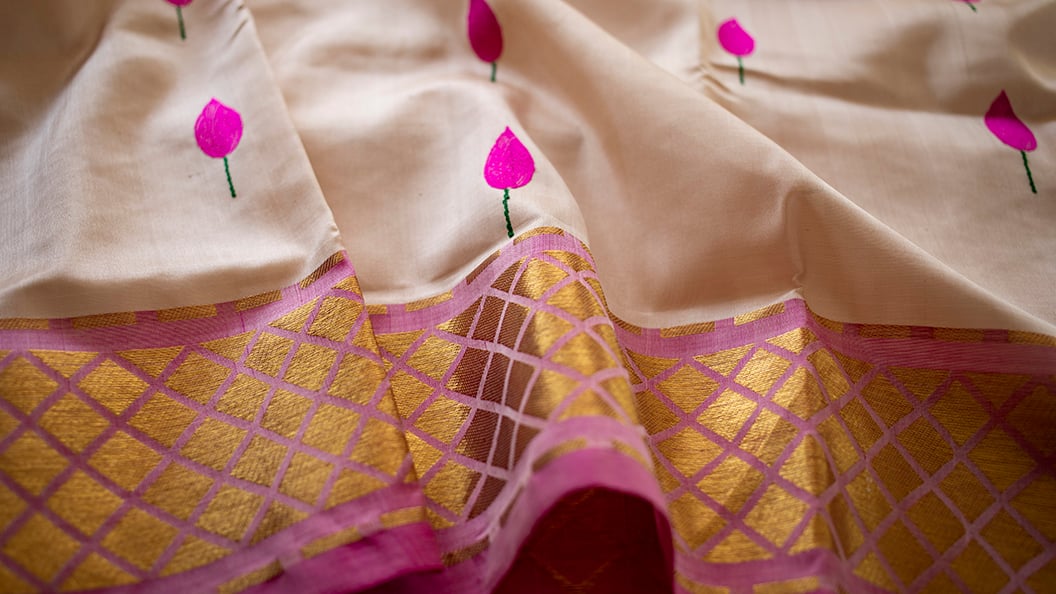 Since 1600 AD, the two communities involved in weaving Venkatagiri sarees are the Padmasali and Devanga. Venkatagiri is woven on cotton and cotton-silk blends. They often use zari, using Jamdani weaving patterns and warp-weft techniques. Most saris have a plain field with some buttas on the field but there is a zari border and pallu that is patterned. Common motifs on the pallu of these sarees include peacocks, parrots, swans, mangoes, and leaves. Borders are also done in zari checks with colour wefting in thin lines.