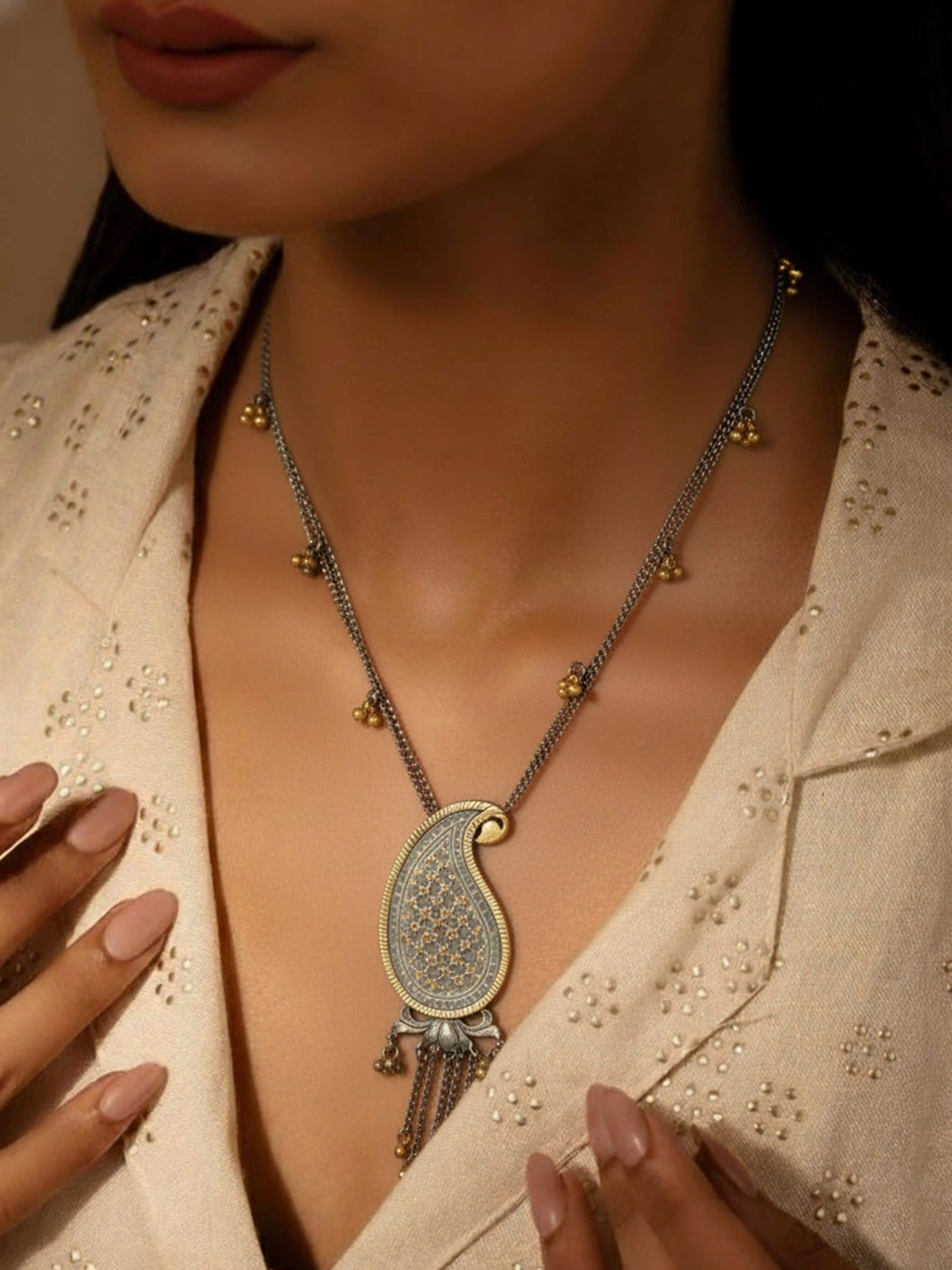 Bidriware entails the inlay of gold, silver, brass, and copper on a black ground that is treated with soil from the Bidar fort. Featuring a paisley motif pendant embellished with geometric patterns often bearing the influence of Islamic architecture, it is this striking contrast between the dark surface and fine metal wire that makes for a bold accessory.