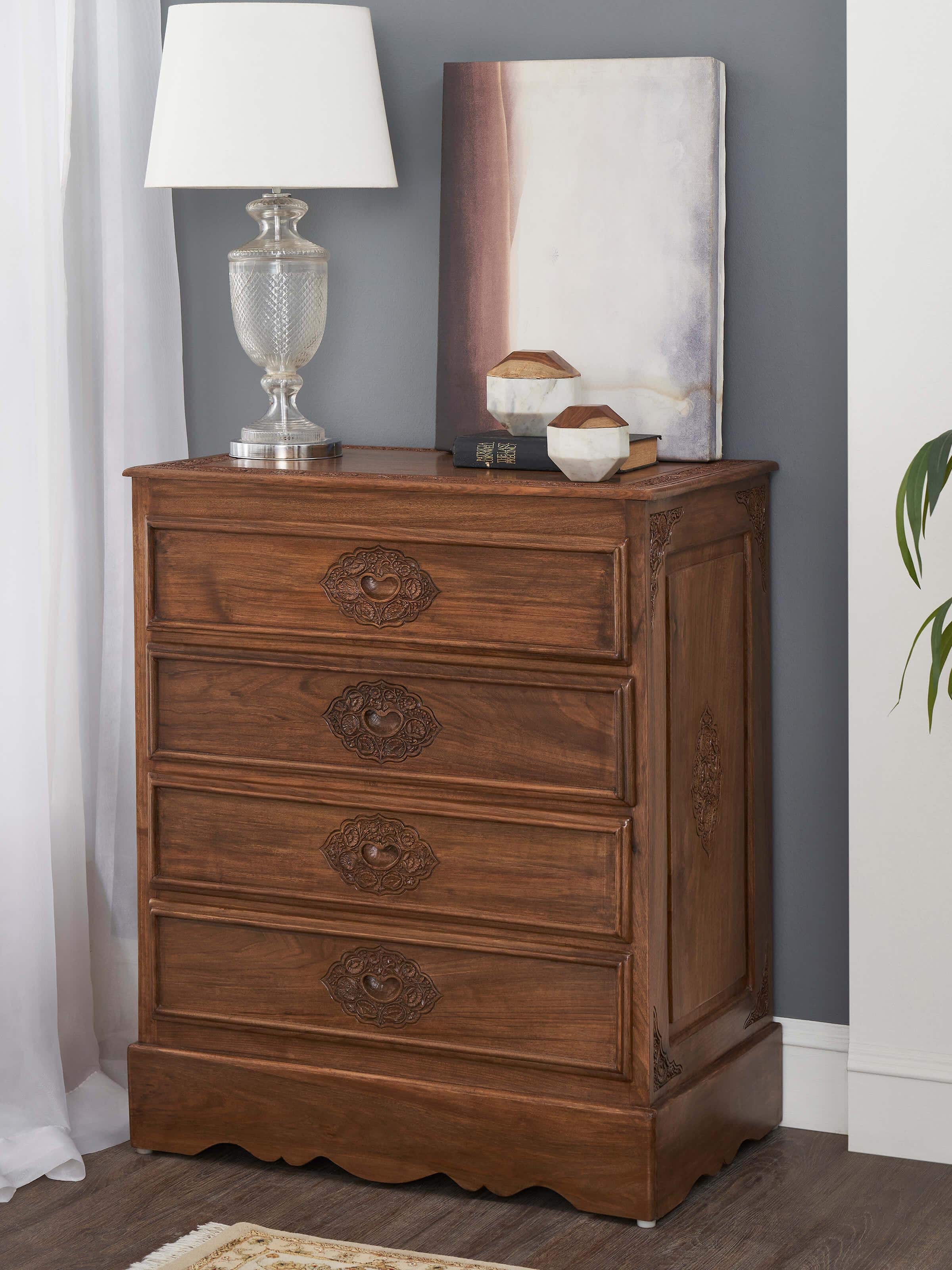 Elevate your interiors with this sophisticated chest of drawers from Kashmir. Crafted from walnut wood with detailed carving, it is equal parts storage solution and striking statement piece.