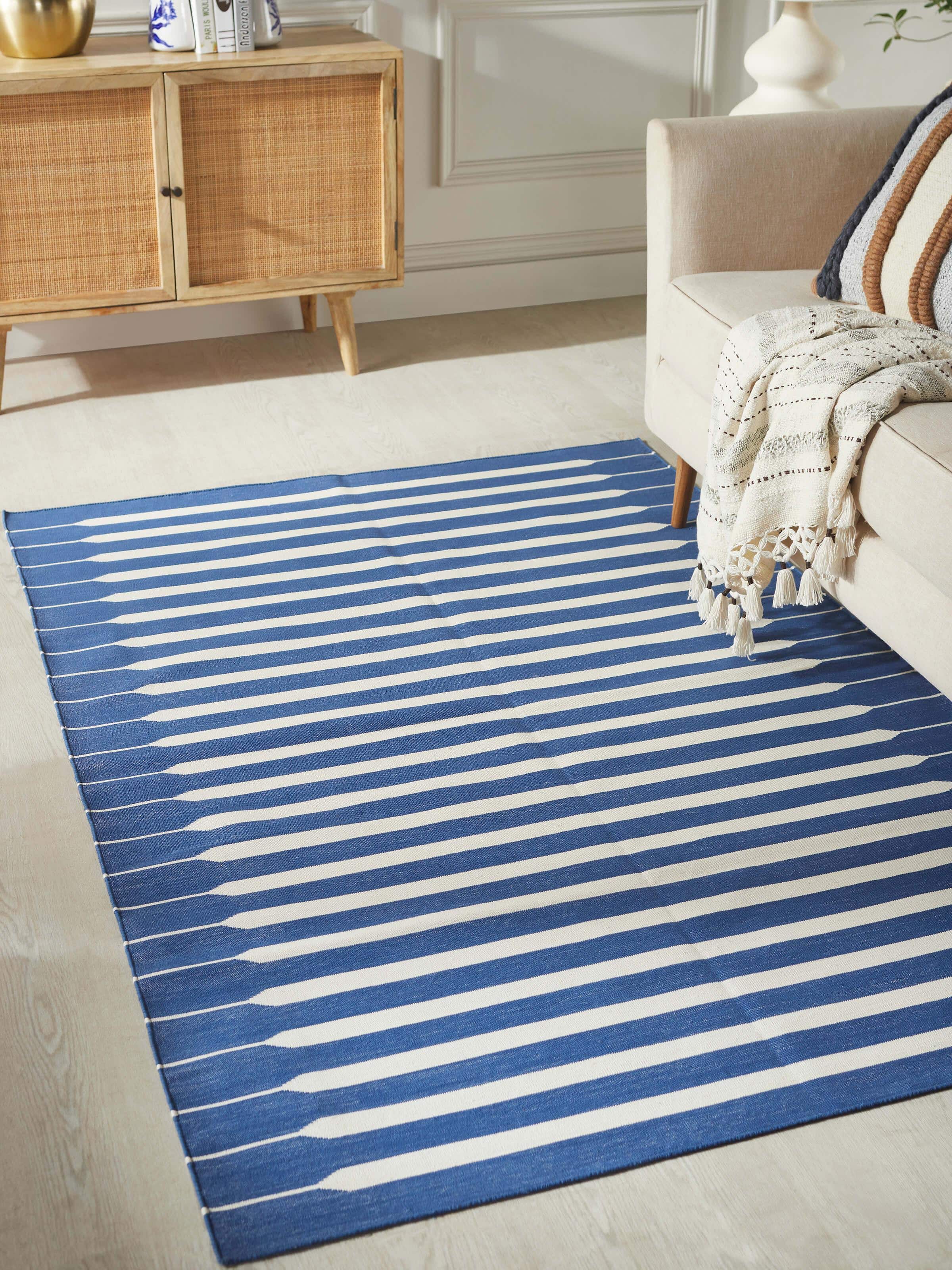 Modern Geo Stripe Blue Lawan Cotton Panja Dhurrie