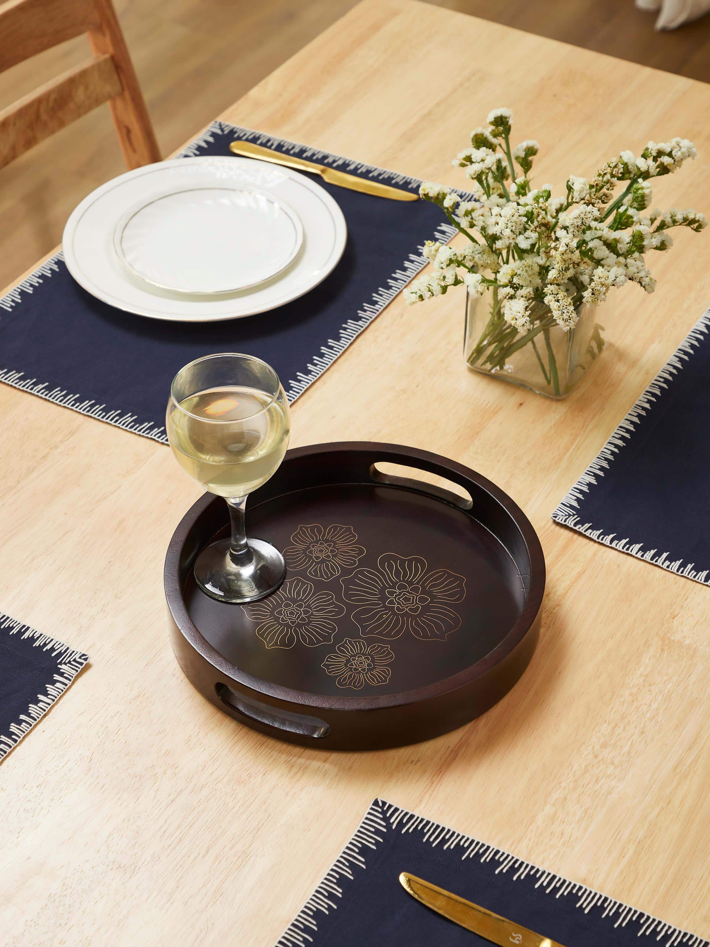 Handcrafted from rich sheesham, this tray showcases the traditional art of tarkashi, a technique of inlaying fine brass wire into wood. Featuring Mughal-inspired geometric and floral motifs, serving your favourite drinks and snacks has never looked this good.