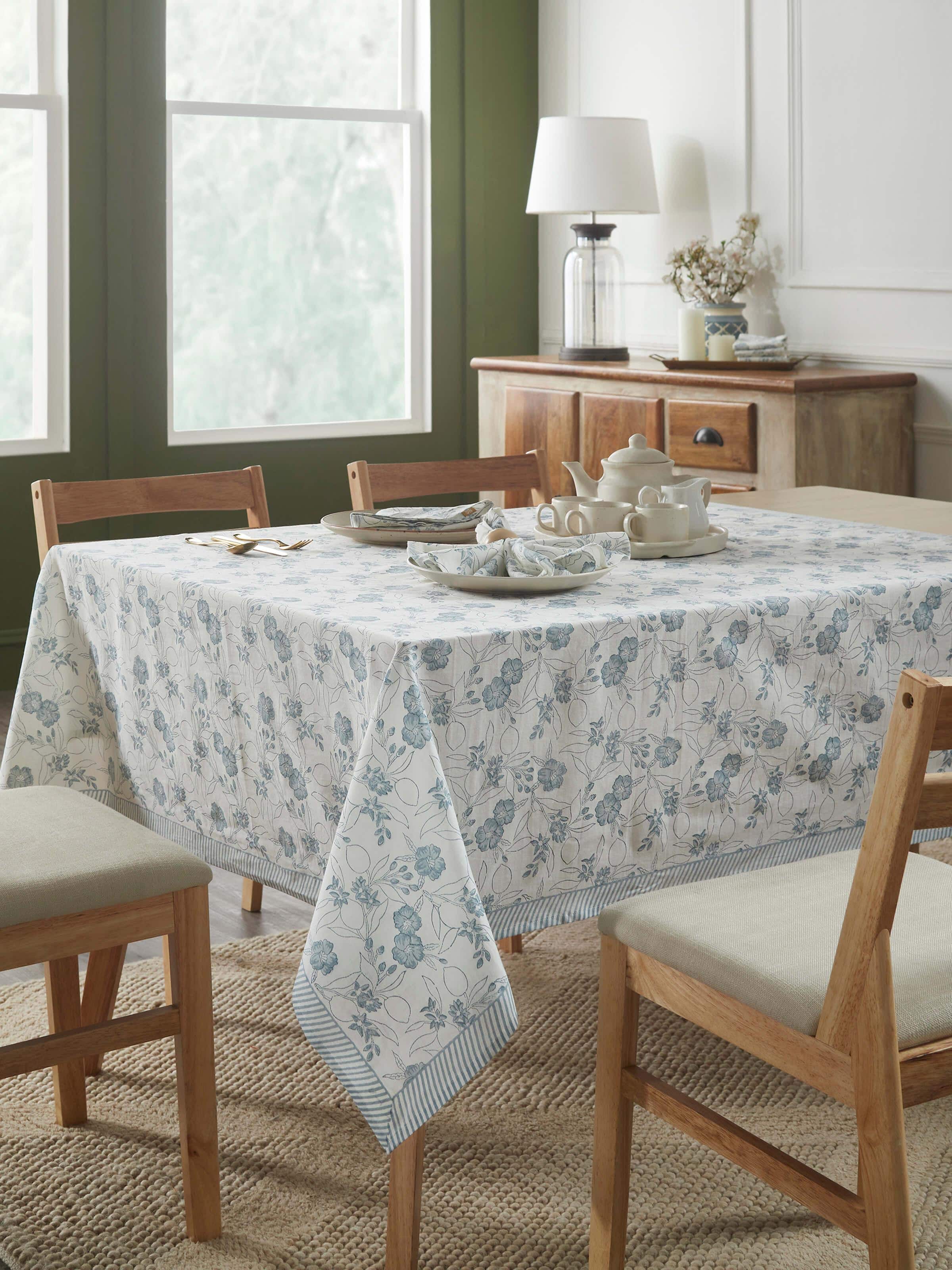 Enhance your setting with this cotton linen table cover, block printed by artisans in Rajasthan. Capturing the timeless allure of Sanganeri floral and lemon motifs, this cover turns every meal into a celebration.