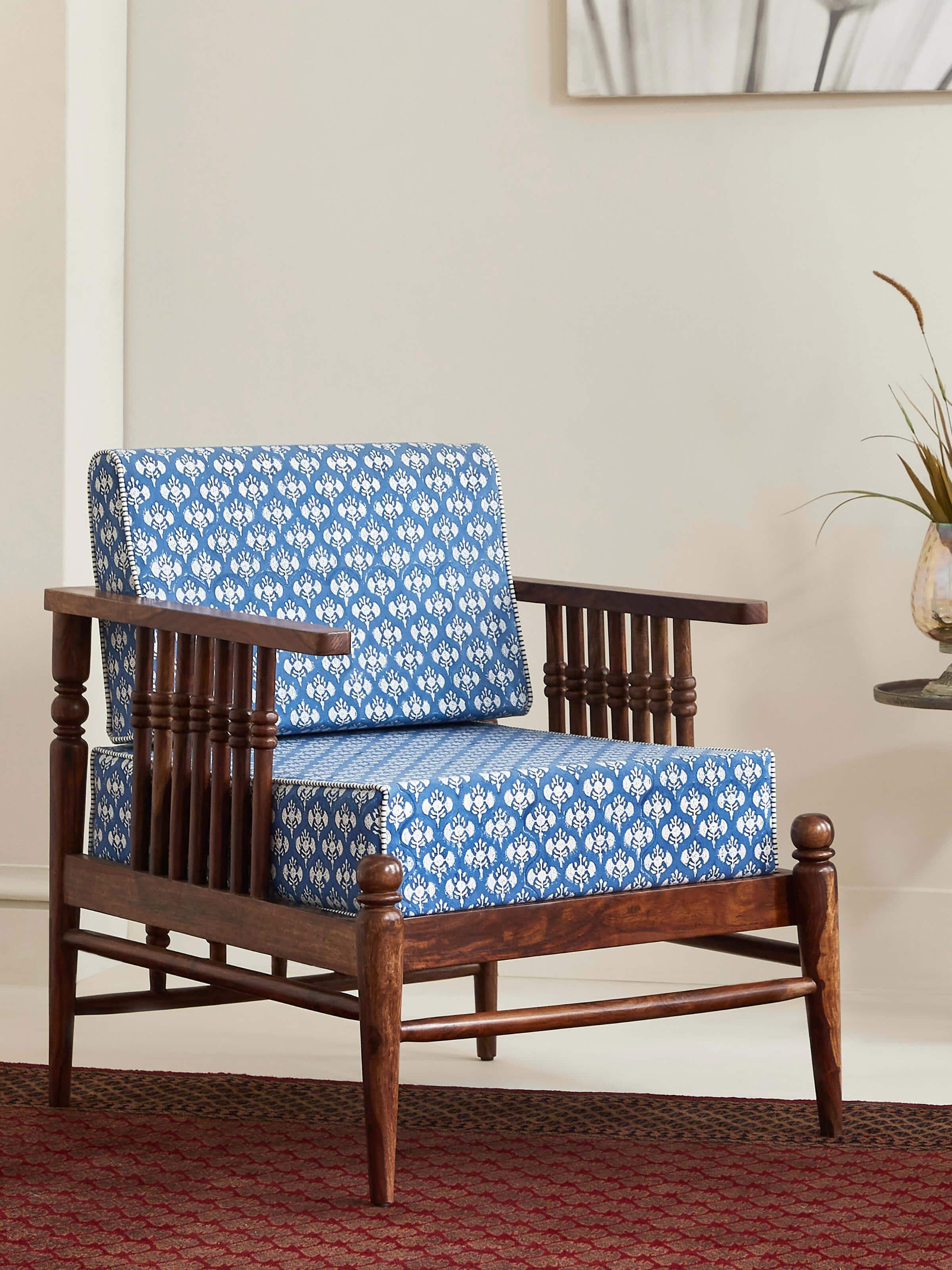 Enhance the overall ambiance with the combination of traditional motifs, sturdy sheesham wood, turning legs, and the inviting design of a lounge chair.
