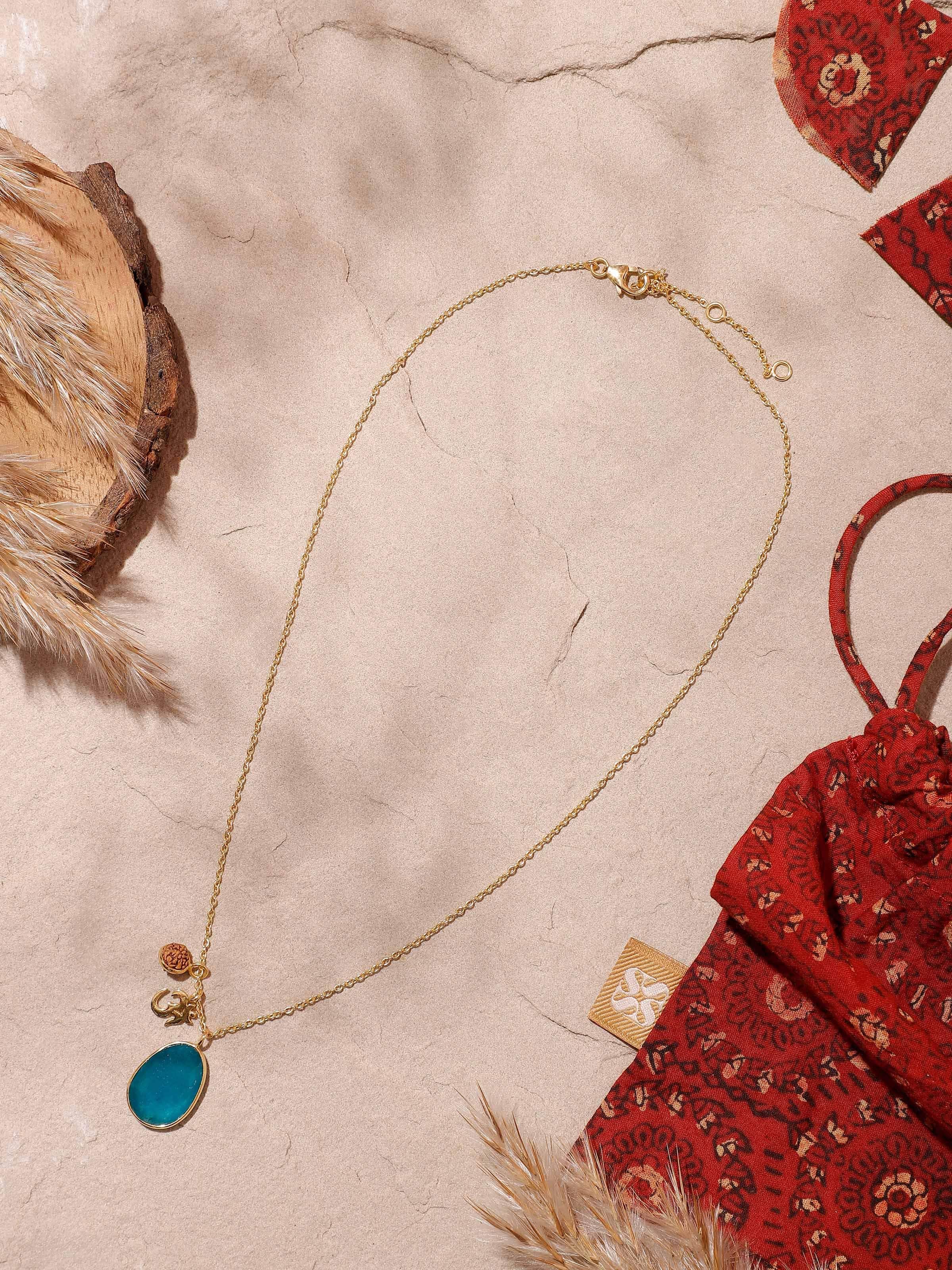 This 18K gold-plated silver necklace features green white jade, panchmukhi rudraksha, and an Om charm for balance, protection, and abundance. Green white jade promotes inner harmony and prosperity, rudraksha shields against negativity, and the Om pendant deepens divine connection.