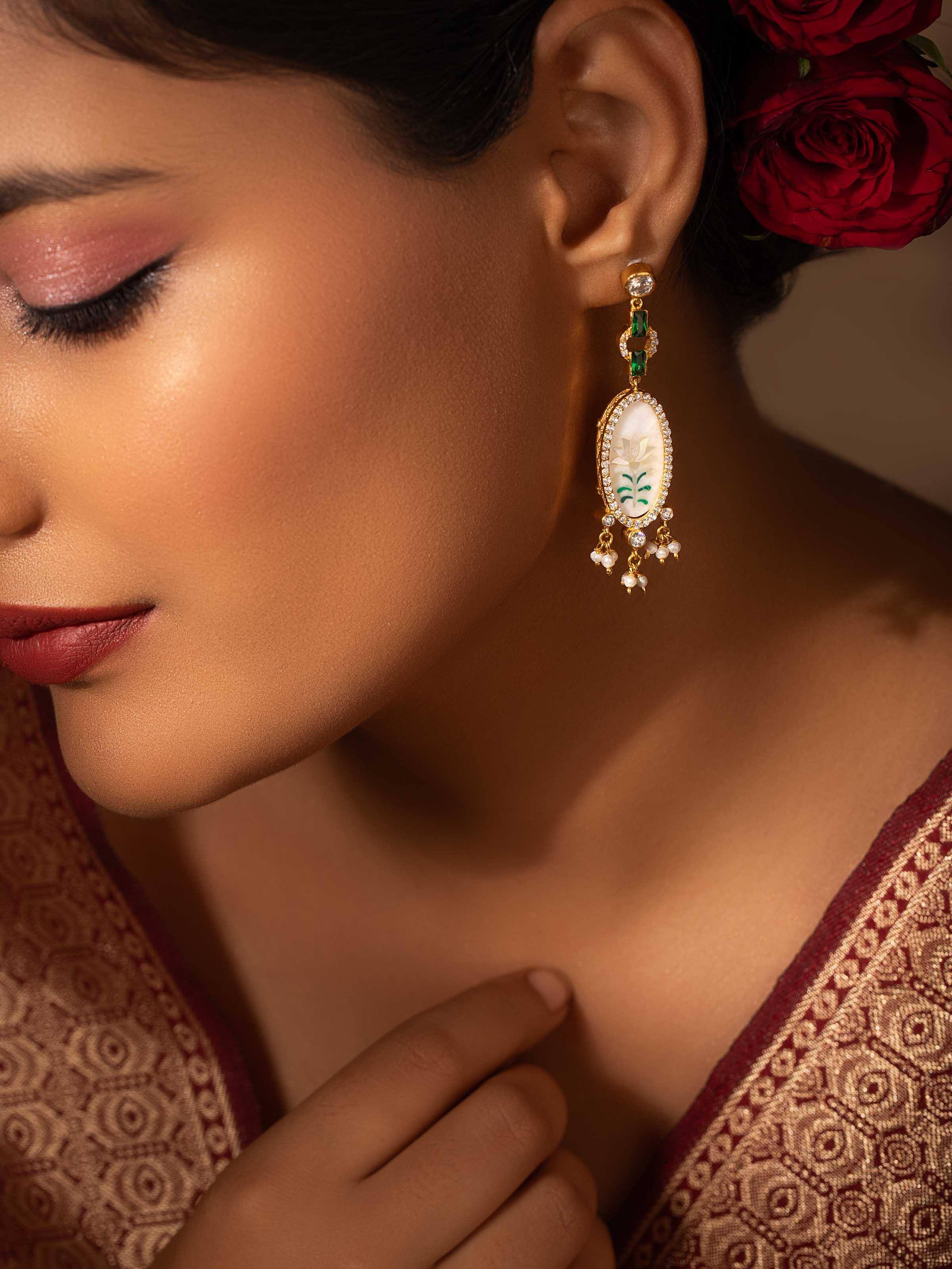 Infuse artisanal charm into your everyday look with our enchanting Parchinkari earrings. Hand-finished by skilled artisans, they feature a mesmerising lotus inlaid on marble. An ode to Agra's Mughal heritage, these earrings pair perfectly with a silk Anarkali kurta.