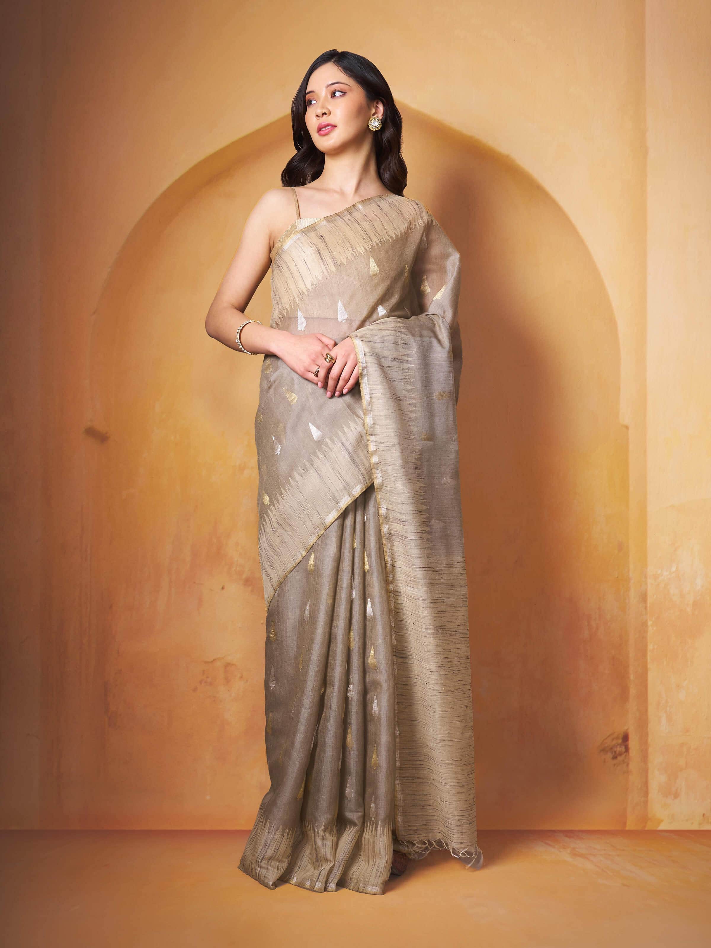Honoring the time-honored weaving traditions of Chandrapur artisans, this pure tussar silk handloom sari features exquisite jaala weaving adorned with graceful flora motifs.