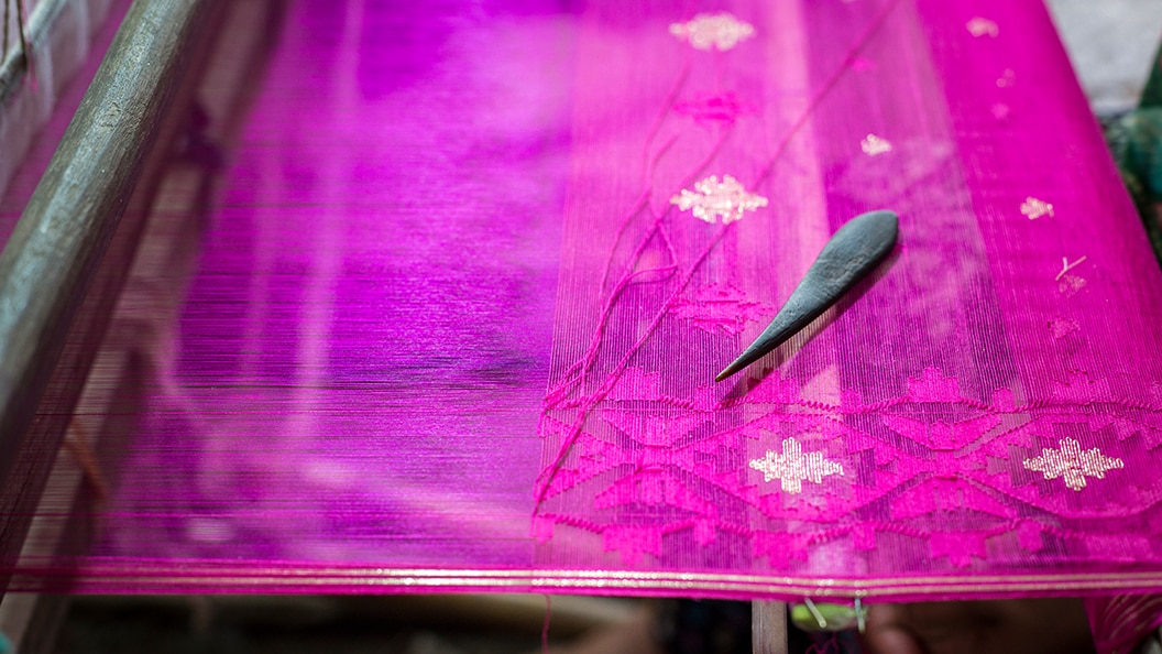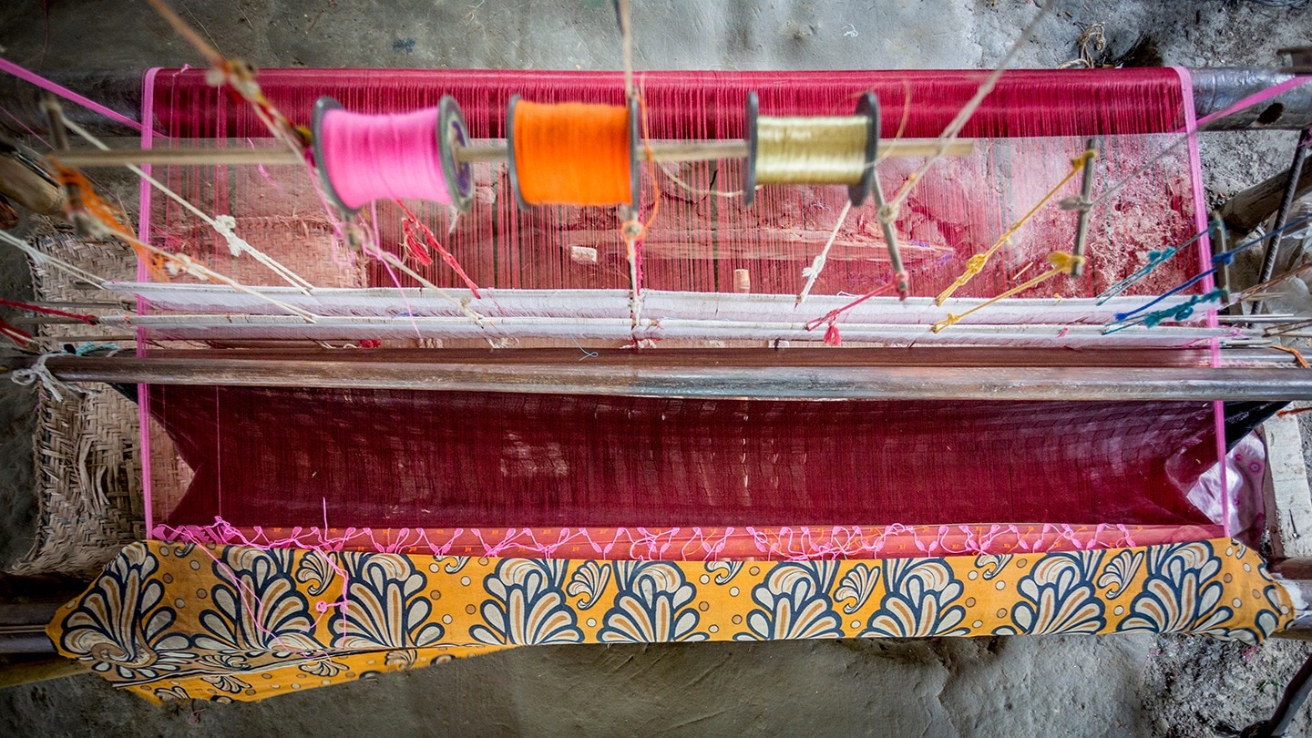 First the warp and weft are woven and then the motifs are embroidered on the loom. The supplementary weft is woven with the kandul, a tool. The weaver then interlaces the threads with bamboo sticks, giving an undulating effect to the weave.