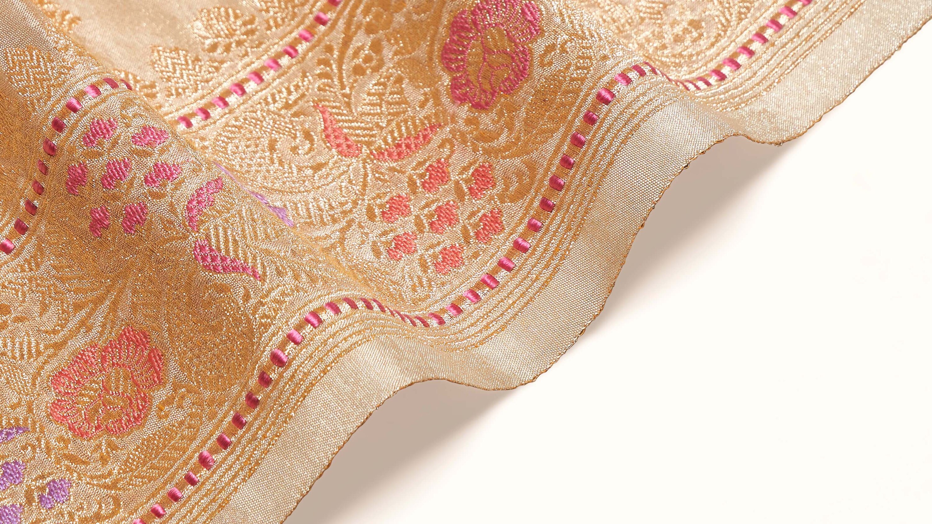 The broad idea of "Banarasi handloom" comes from several elements. First is the textile weaving tradition of Kamkhwaab or Kinkhwaab, where patterned silk is densely woven with metal-wrapped thread or brocade. Others include handspun khadi of 250 counts, zari woven cottons, jamdanis in cotton and silk, tankhas and heavy shimmering silk gyasers, kadua weaving, and more.