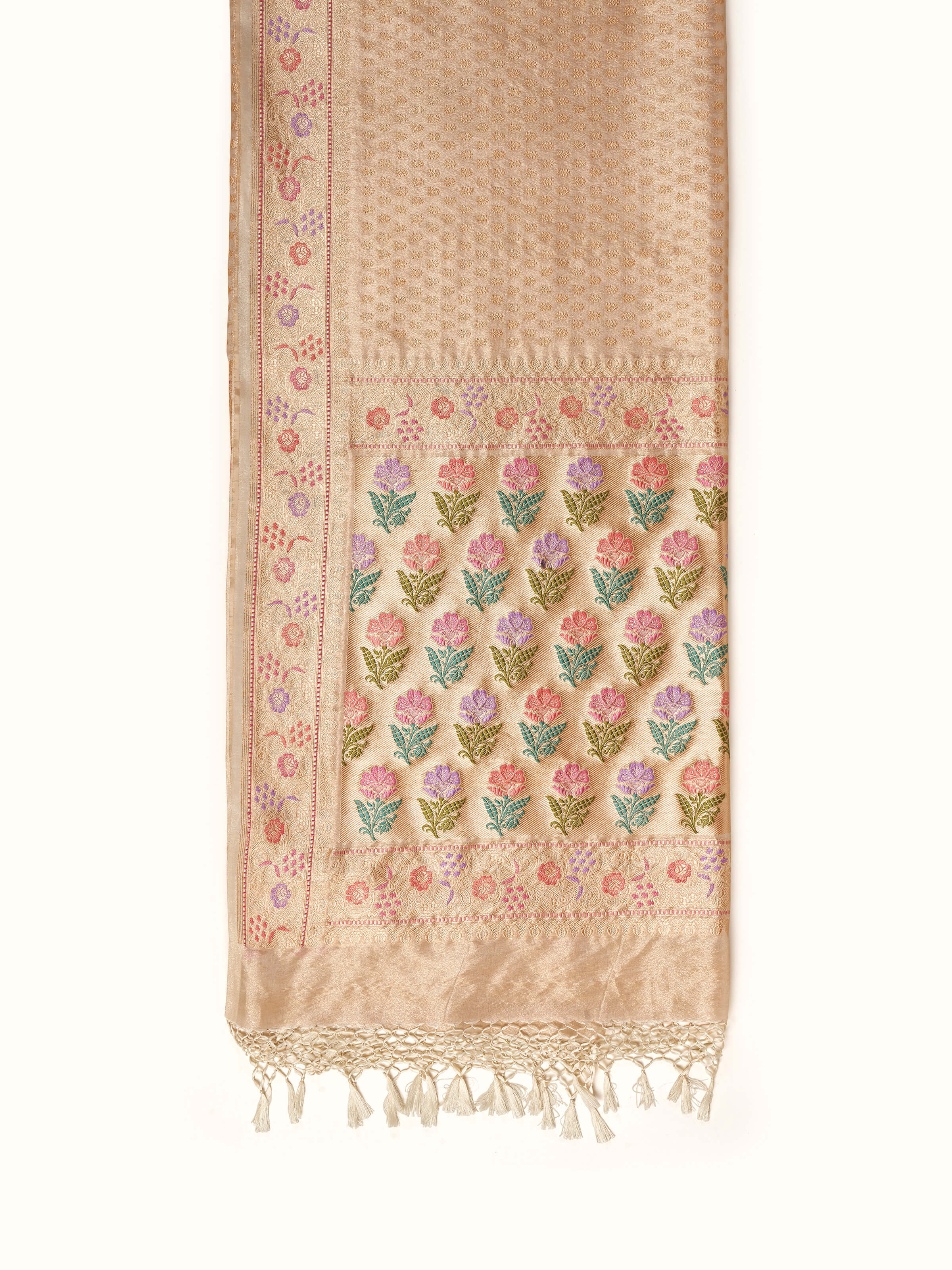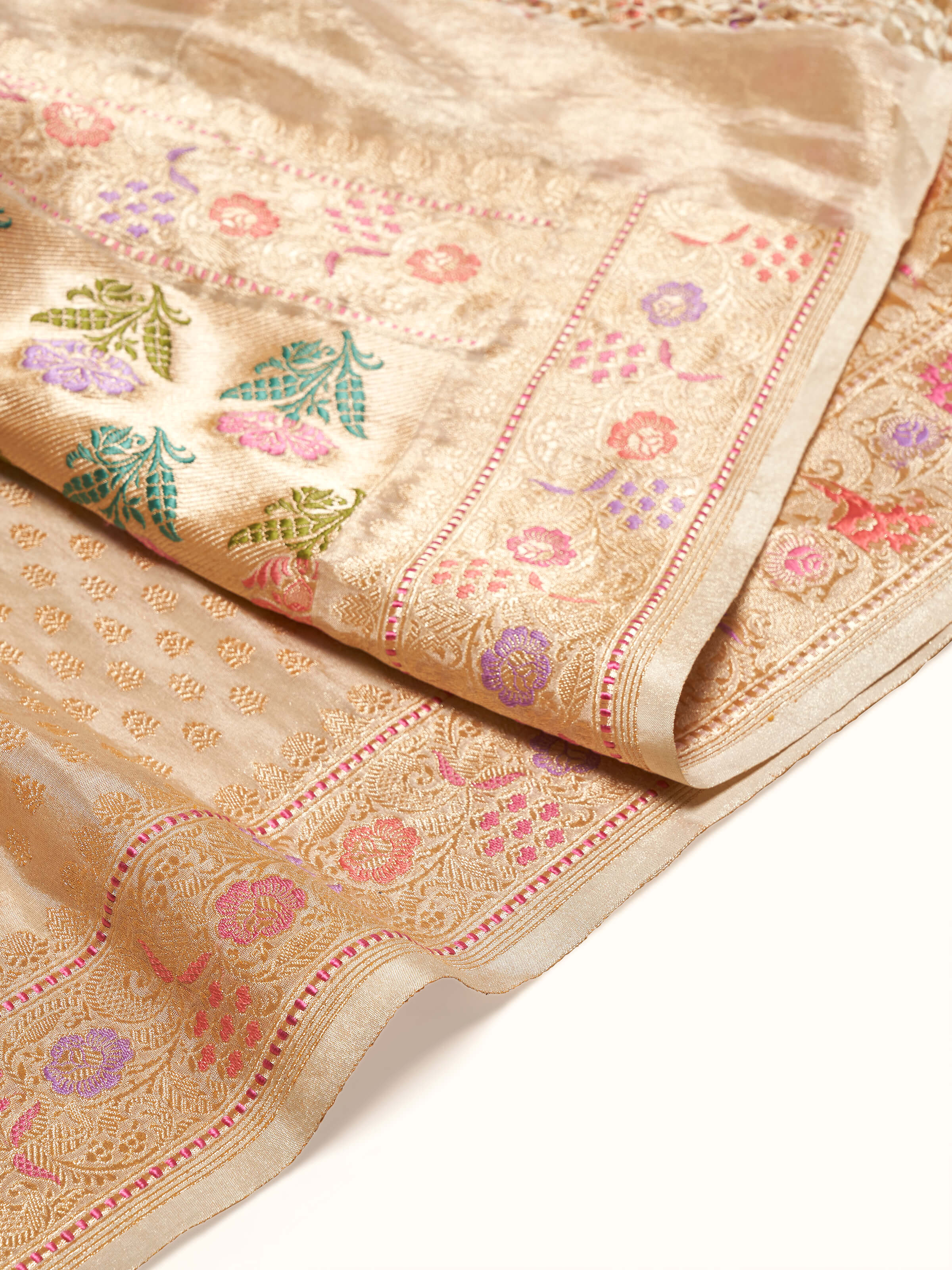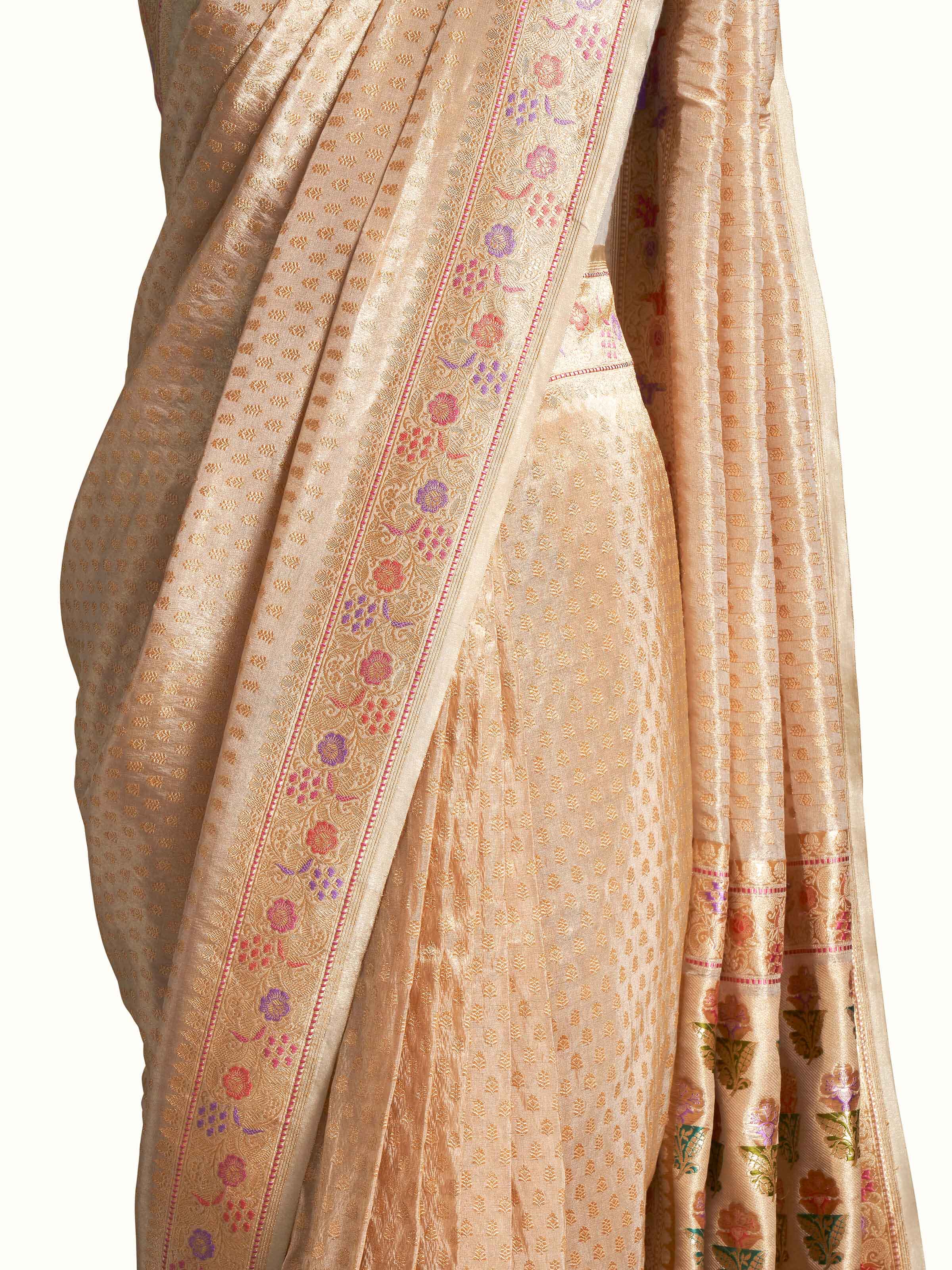 This exquisite handwoven Banarasi tissue saree is a testament to timeless craftsmanship, set against a soft ivory base that exudes understated elegance. The warp is pure silk, while the weft is crafted in fine silver zari. The body is adorned with 56,000 meticulously woven silver zari butis, complemented by delicate ruby meenakari flowers blooming along the vines of the border.