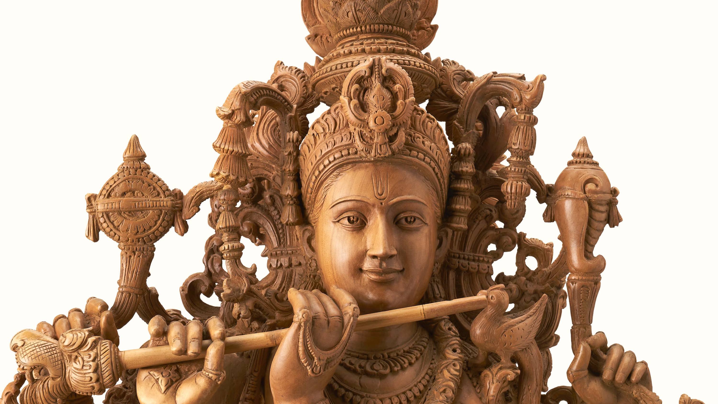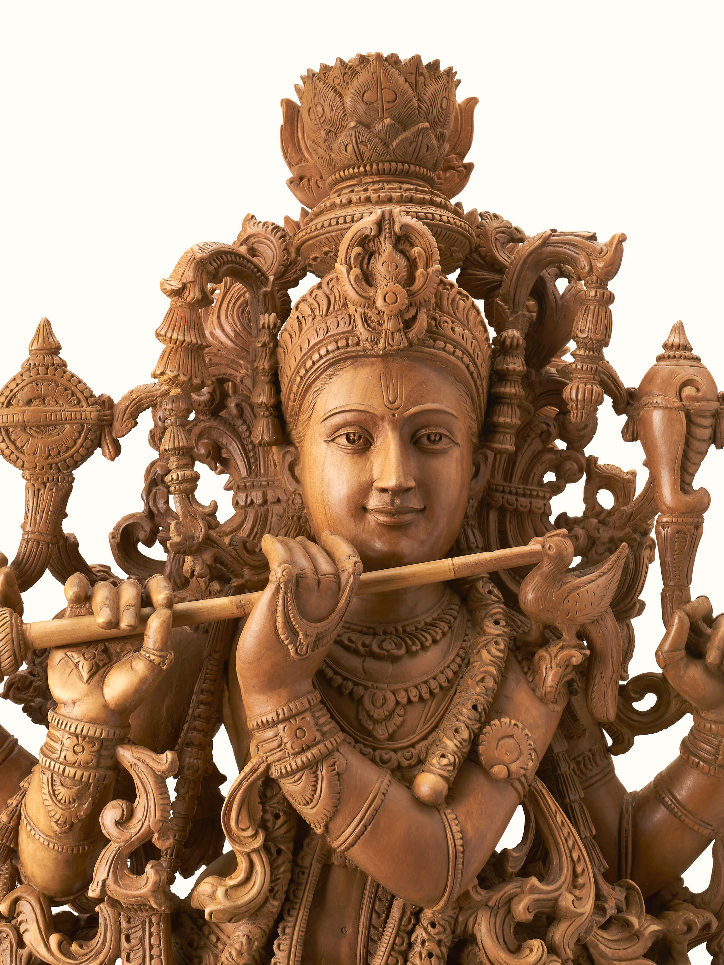 National Awardee Devi Das Shet is a second-generation sandalwood sculptor. His rendering of the form of Krishna in the 12th-century Hoysala style of stone and wood carving is marked by dense, coiled vine-like patterns. The use of heartwood and the fragrant core of sandalwood makes this a rare idol.