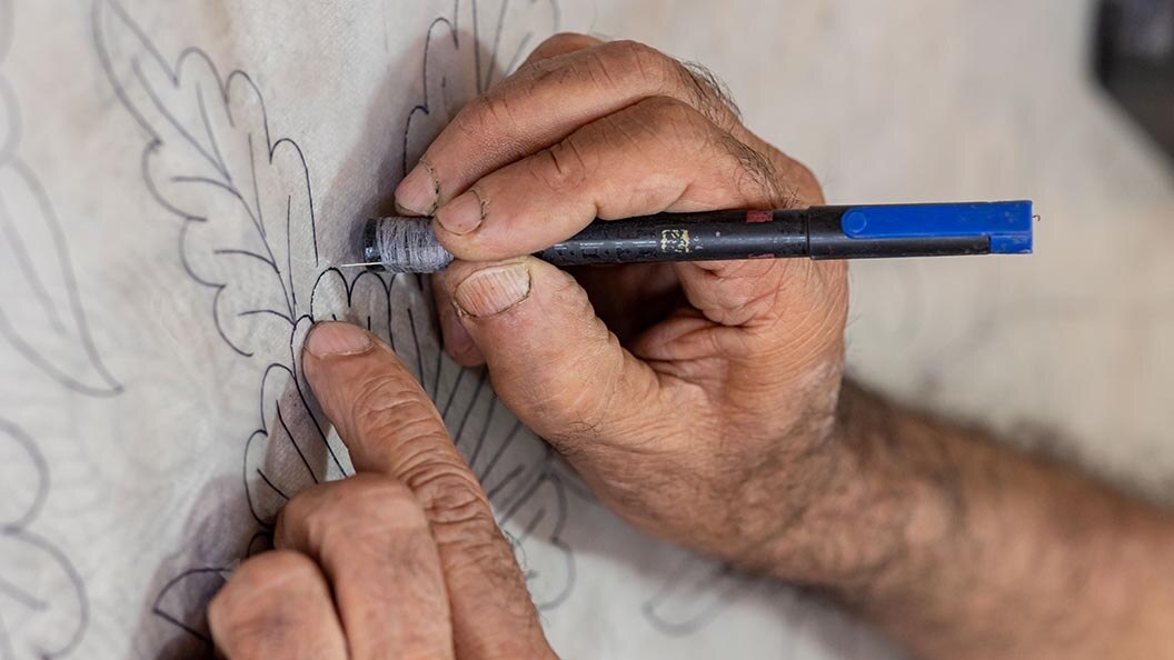 The karigars use threads of wool, cotton or silk and sew with the aari, a traditional needle with a hook and a wooden handle. Artisans create the Jalakdozi by guiding the woollen thread across the designs and manoeuvring the aari with precise alignment. Before that, the naqaash (pattern maker) meticulously traces a design which is then transferred onto tightly woven dusoot (cotton fabric), which acts like the canvas. This base fabric can also be of rayon, silk or pashmina.