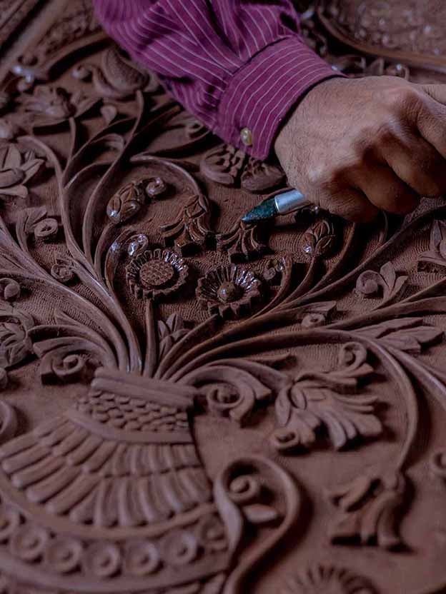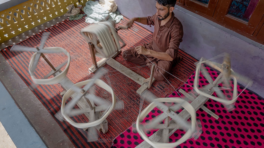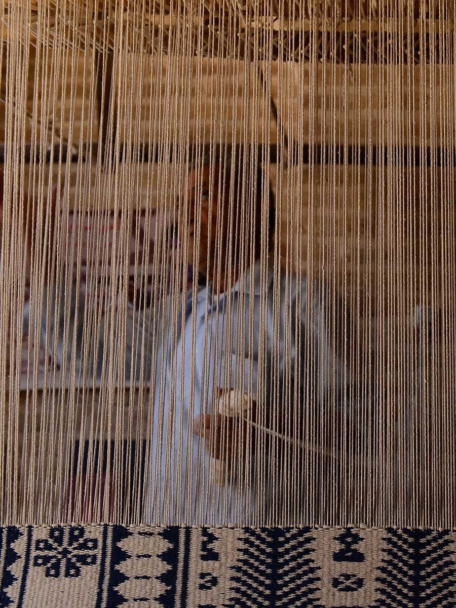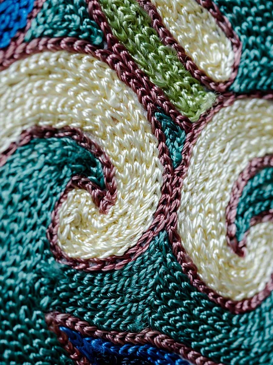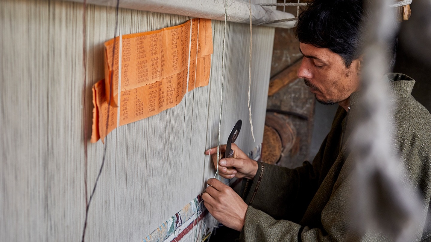 The art of weaving has been passed down generations only by word of mouth. The intricate designs are created through knowledge that has come down to the weavers orally, or through handwritten talim (scripts) that describe patterns, ways of weaving and the dyeing yarn. Each hand-knotted carpet uses indigenous wool or silk in jewel tones. They sometimes feature 3600 knots per square inch. It takes weeks, sometimes months, of meticulous craftsmanship by one or more artisans to finish one piece.