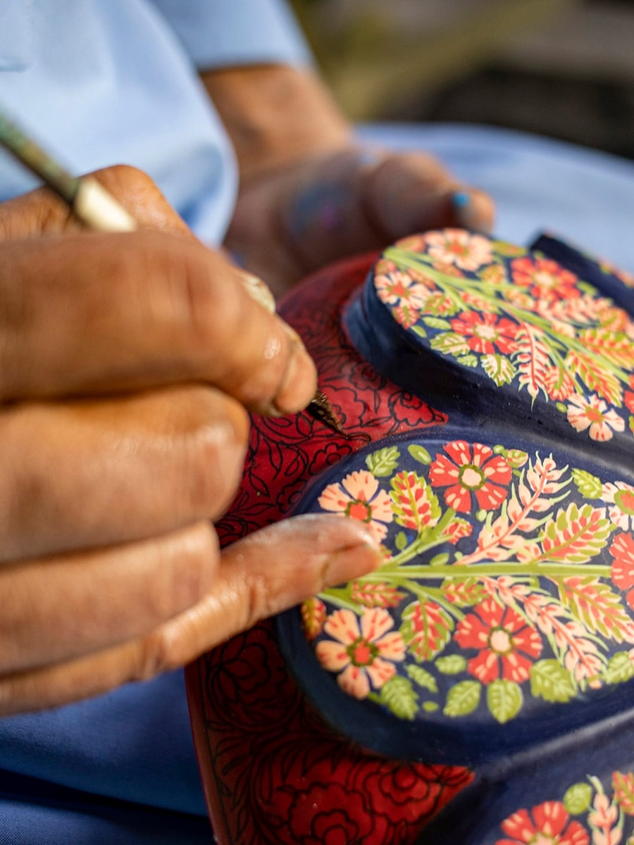 The silk and woollen carpets from Kashmir are considered to be some of the world’s finest handcrafted heirlooms. Nimble-fingered craftsmen from the Valley work their magic as they sit at their looms.