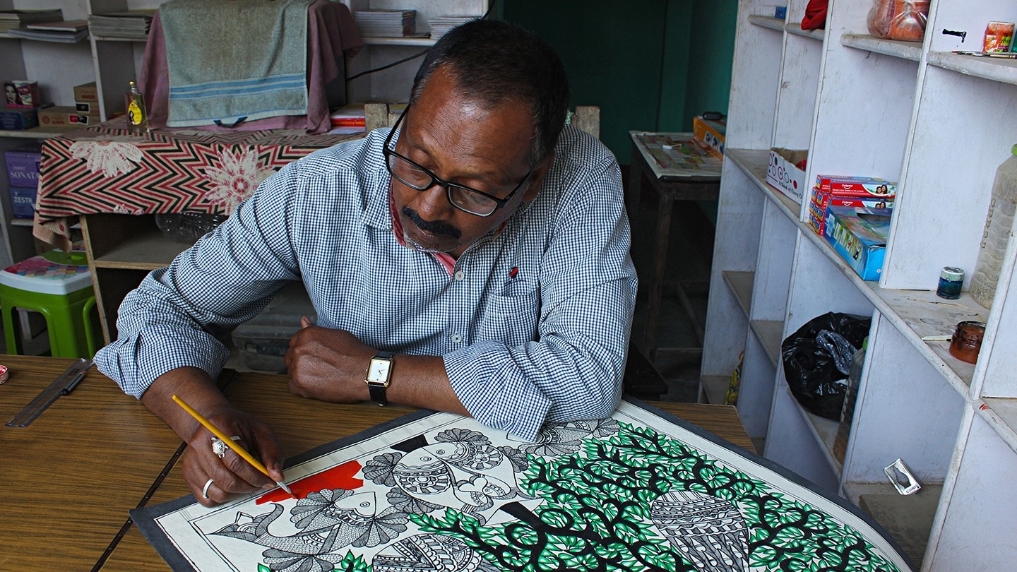 Madhubani was traditionally done on the walls of homes. In contemporary times, artists also use handmade paper as a canvas for the mythical figures, flora and fauna. First, they create outlines with nib pens. Colours are applied with brushes, twigs, matchsticks and even fingers. The colours come from natural ingredients, like soot, turmeric, rice powder, leaves, and indigo, as well as kusum and tesu flowers.