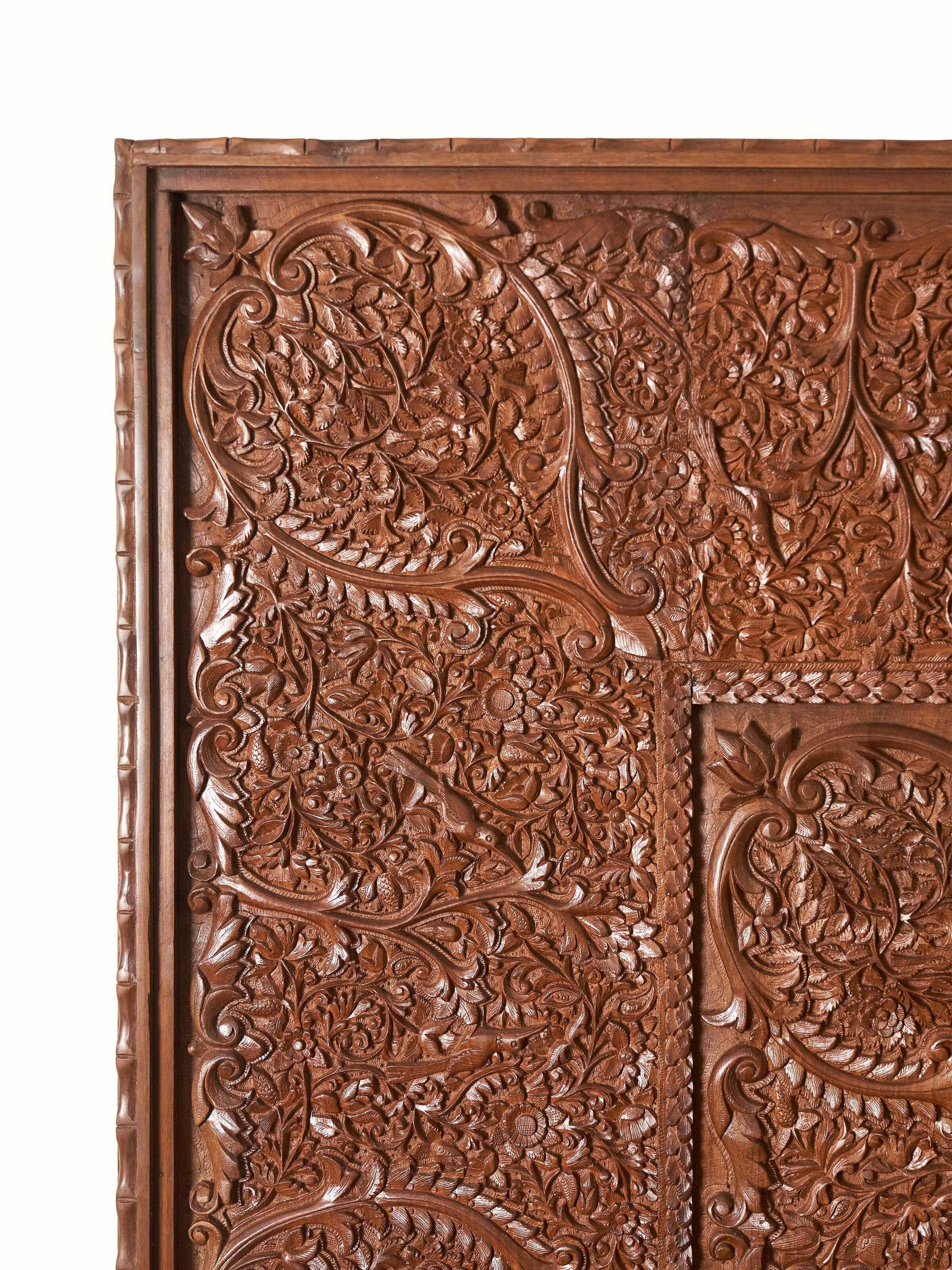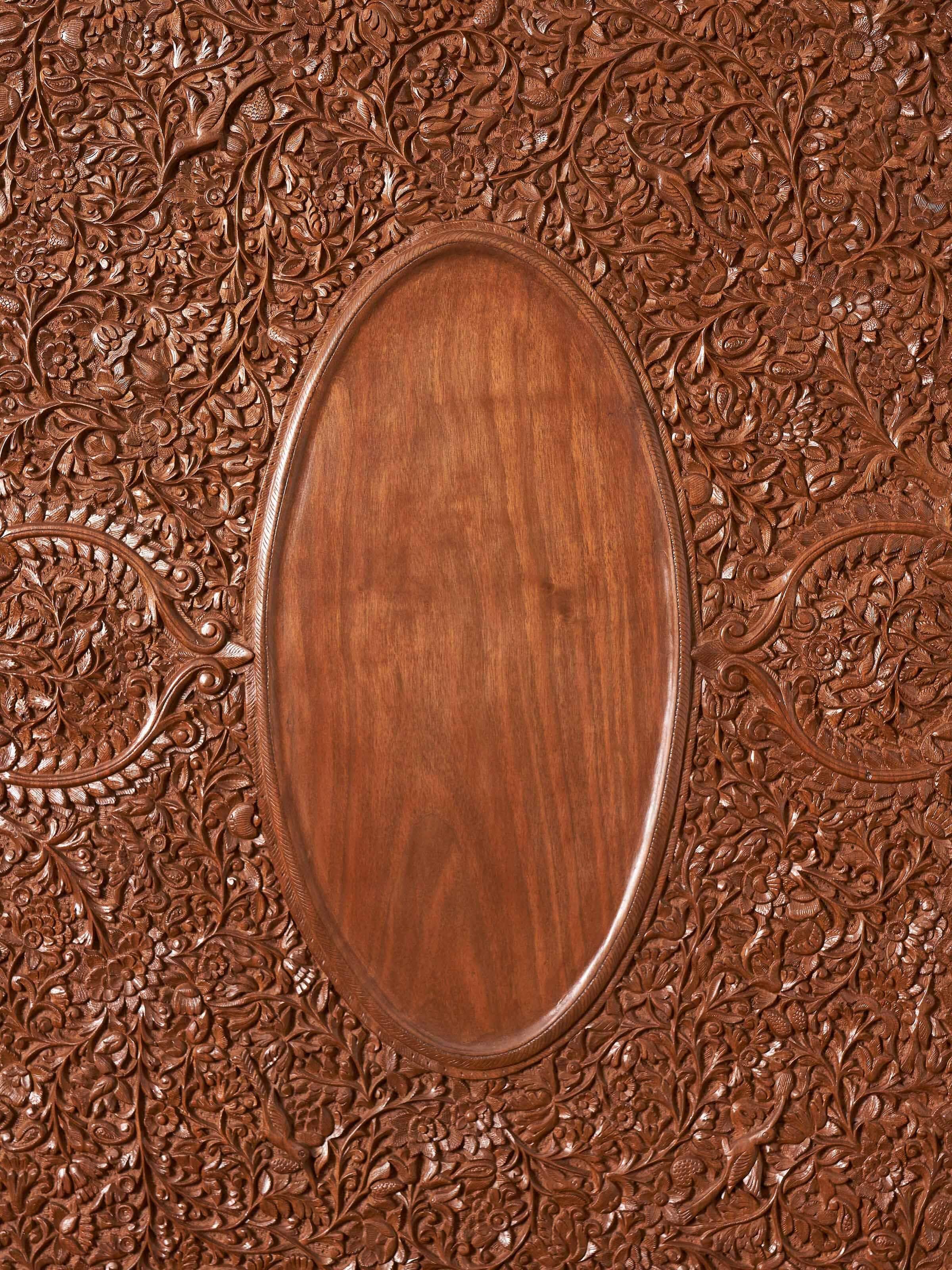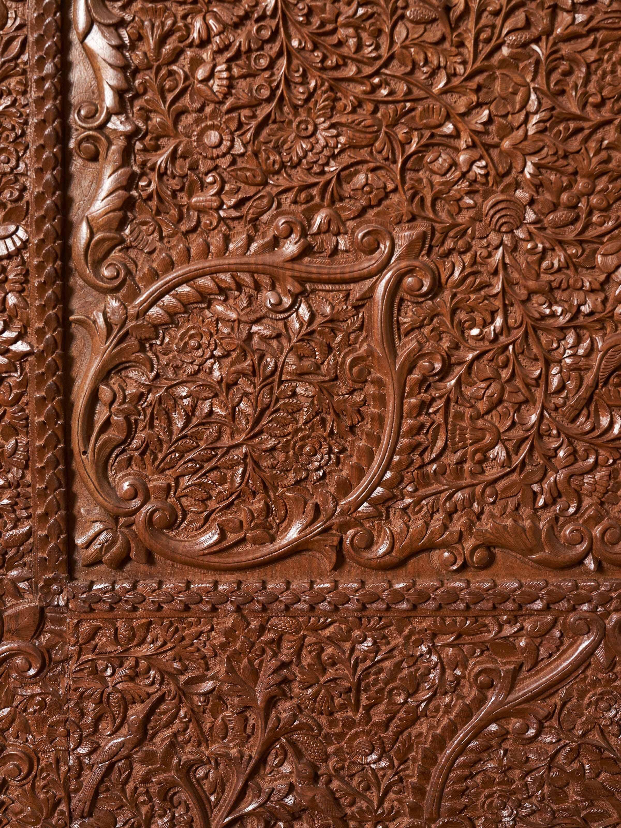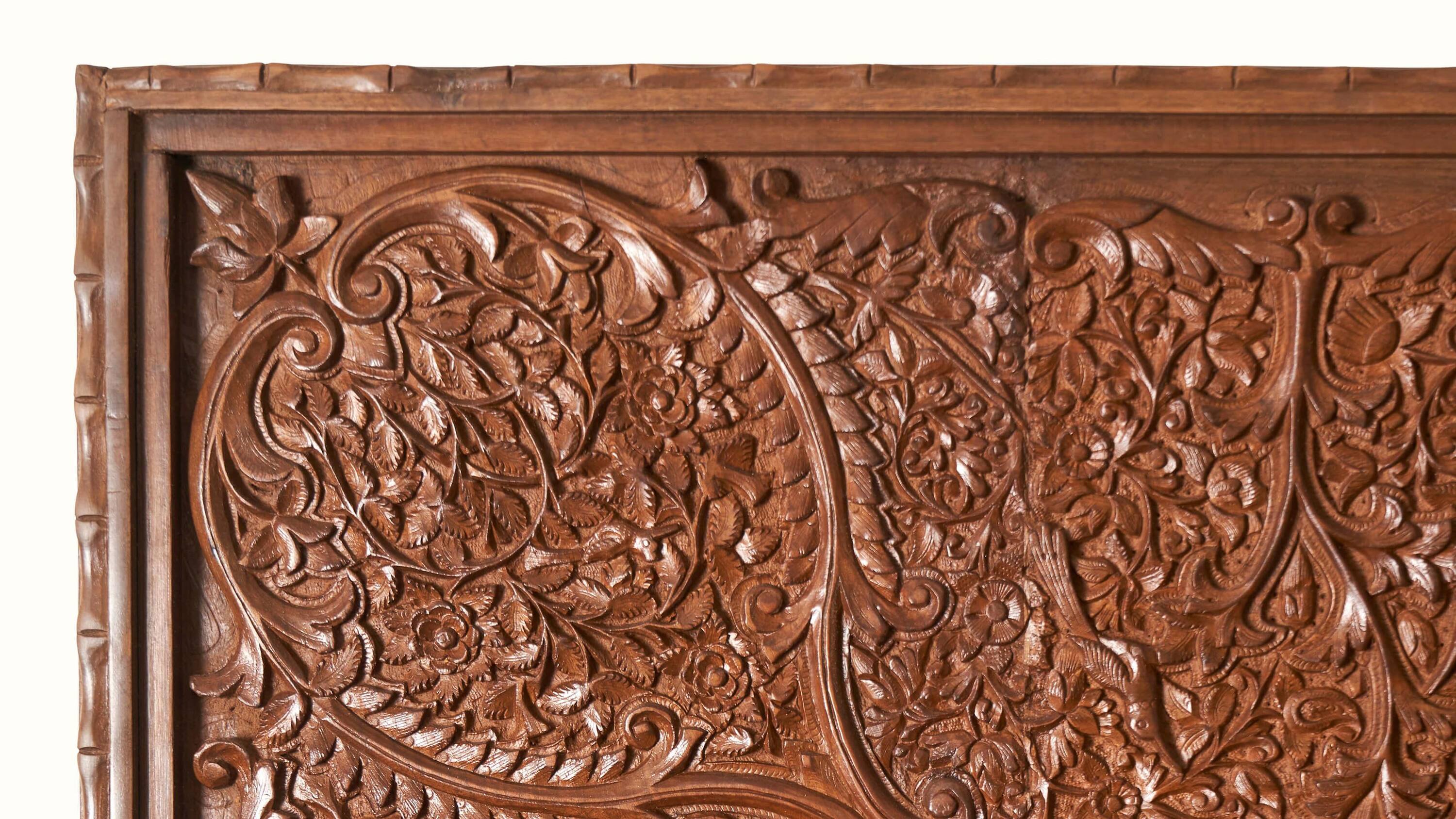 The richly carved, flowing vines and birds on the wood surface remind one of the famed sozni and kani shawls of Kashmir that make use of similar forms and motifs.