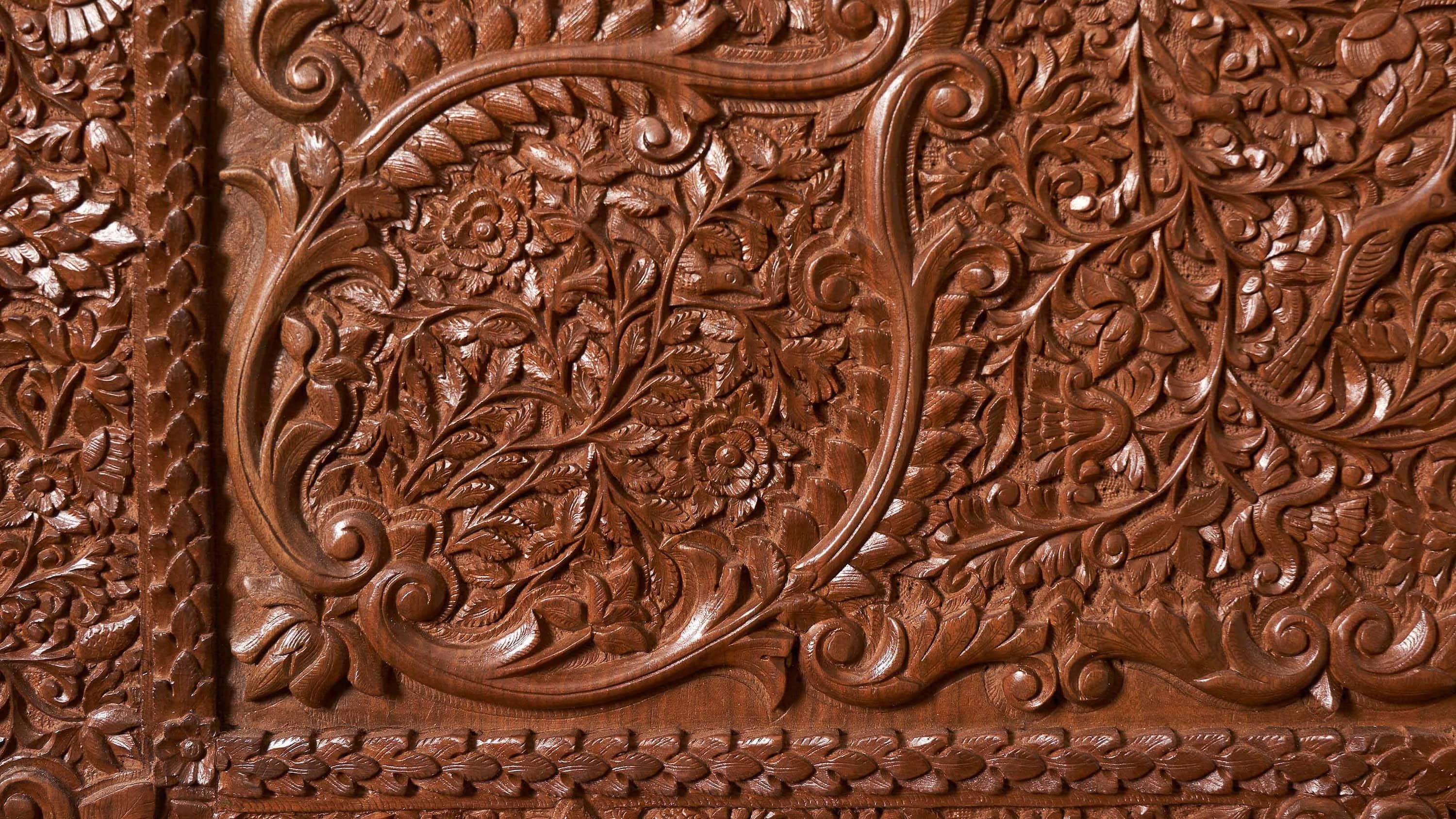 In Kashmir, wood from the walnut tree is among the preferred woods for carving doors, tabletops, and the geometric khatamband ceilings. While floral webs and hunting scenes draw from Persian imagery, landscapes hold a local flavour through motifs like the iconic chinar (oriental sycamore) leaf and shikara (Kashmiri wooden boats).