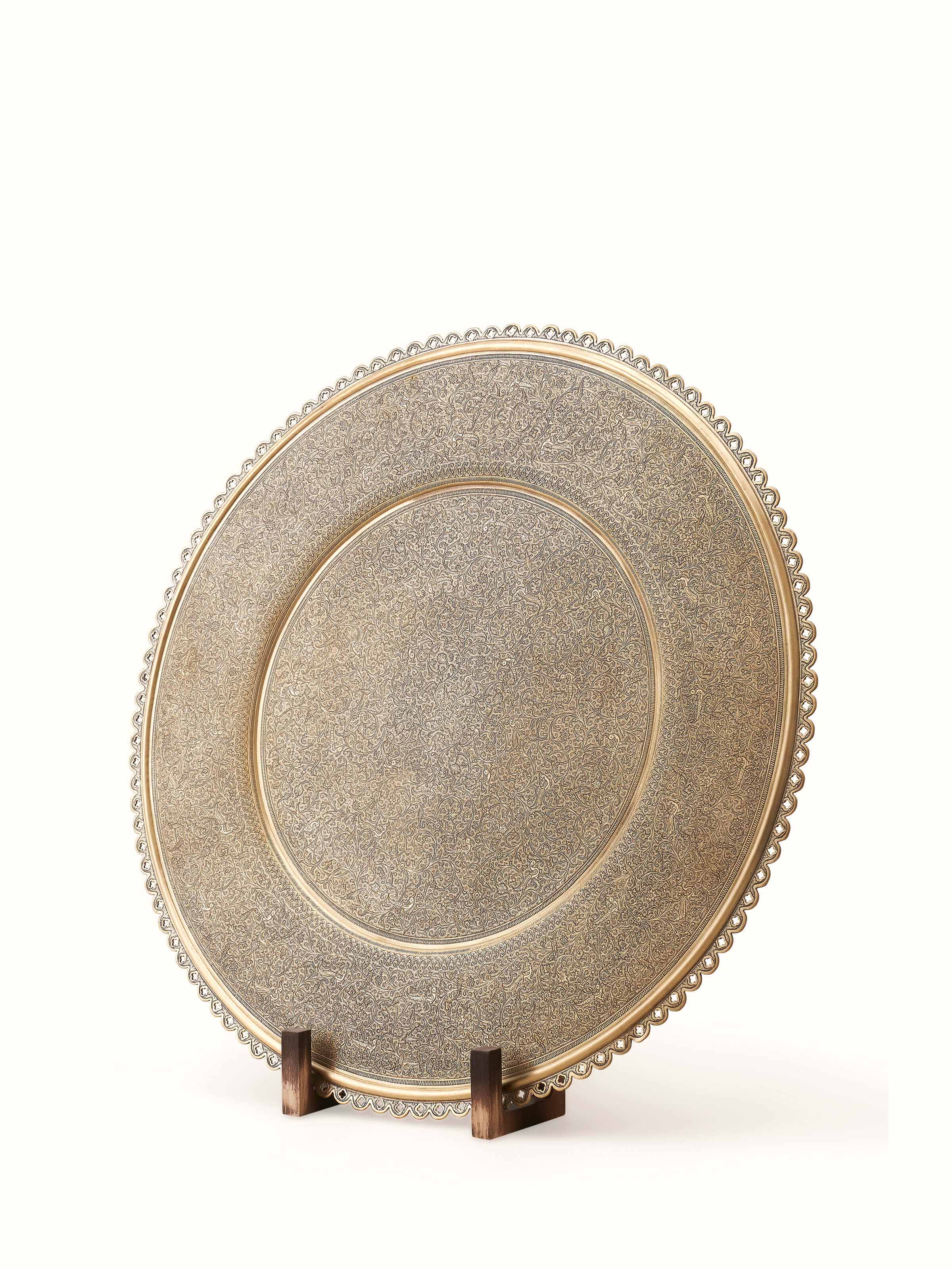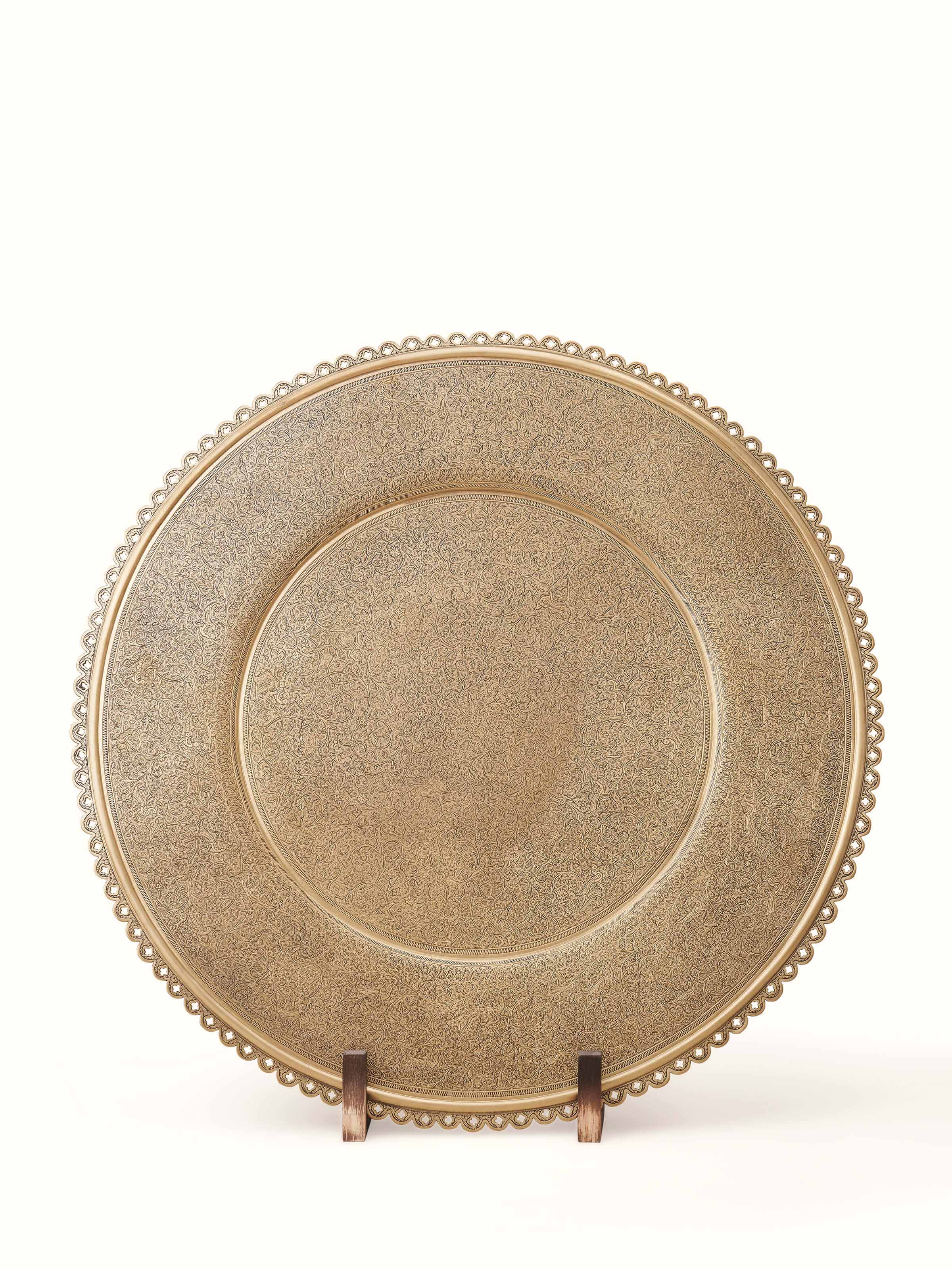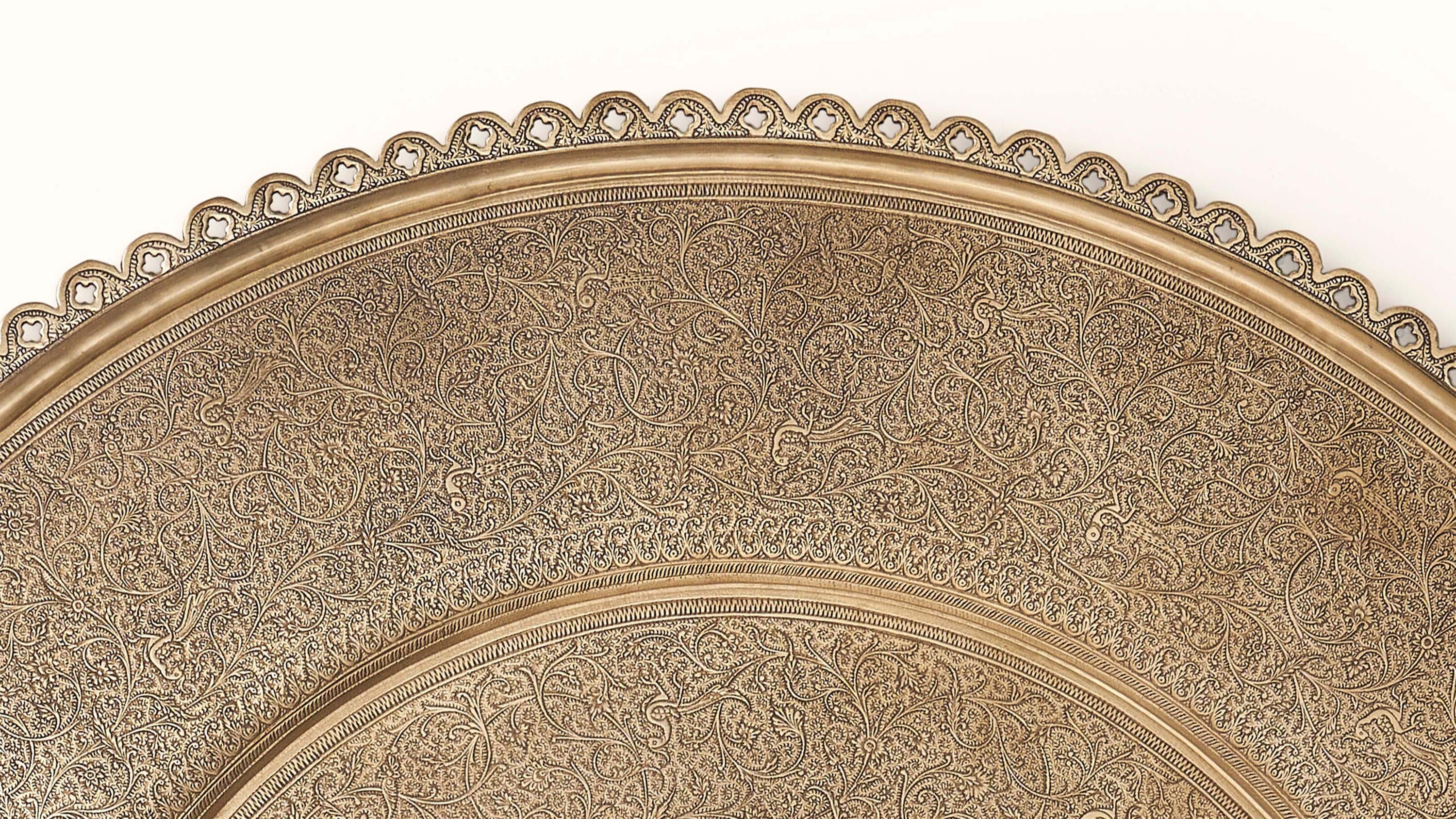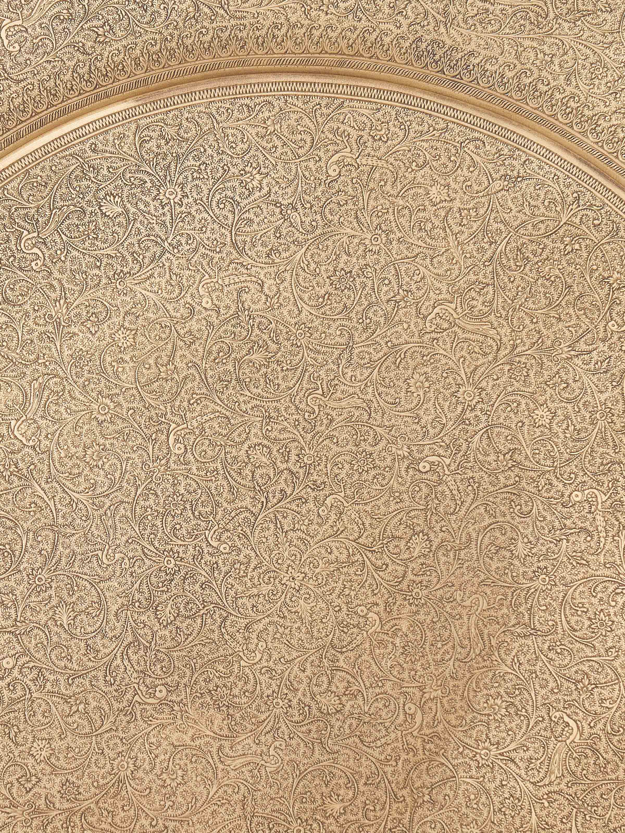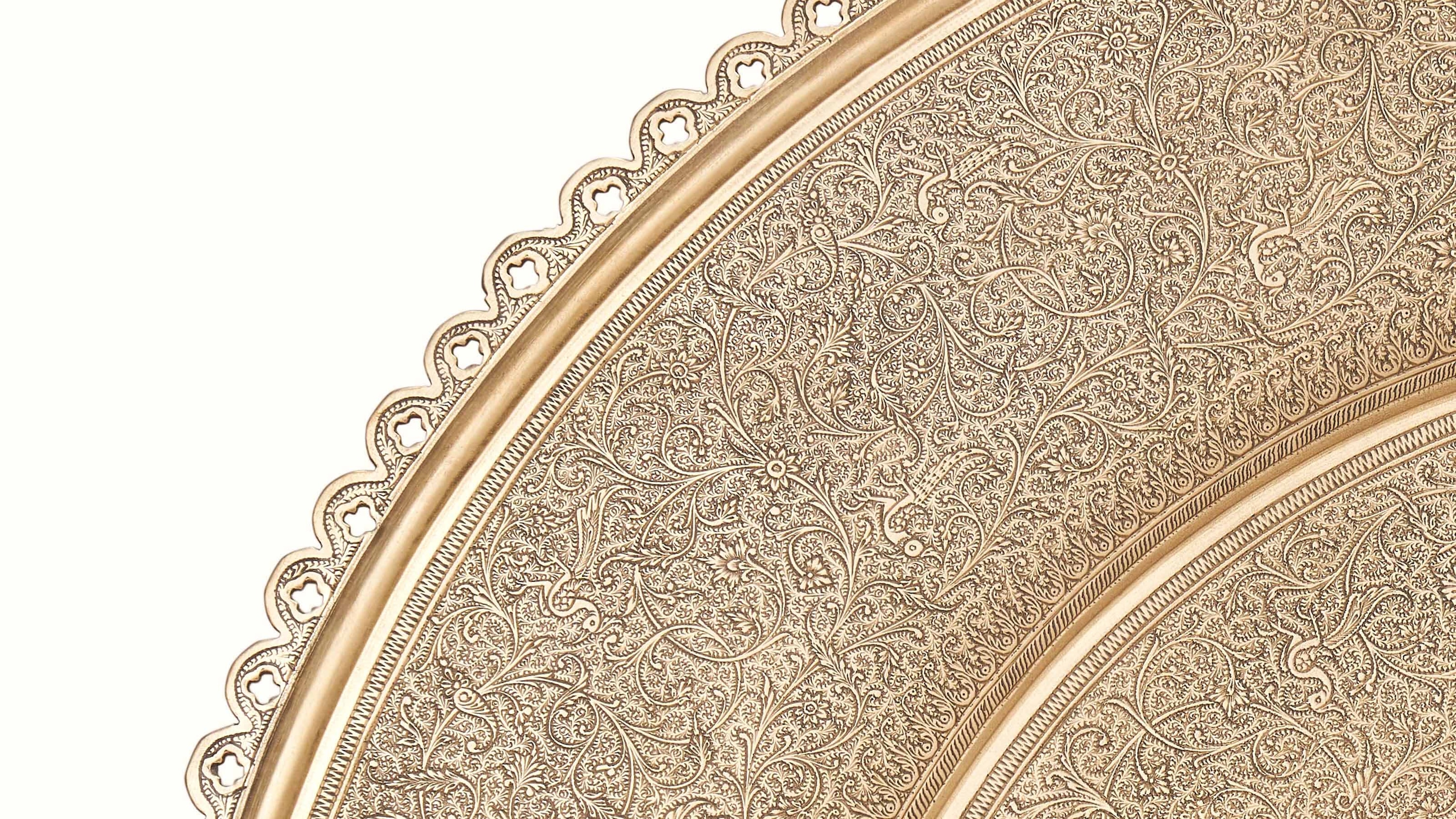 Moradabad is renowned for its brassware––both utilitarian and ornamental. Ritual objects like kalash (pots to hold holy water), traditional wedding gifts like paandaan (a box for betelnuts and leaves), and vases are embellished using a variety of engraving techniques with floral patterns, arabesques, or densely laid out trellises.