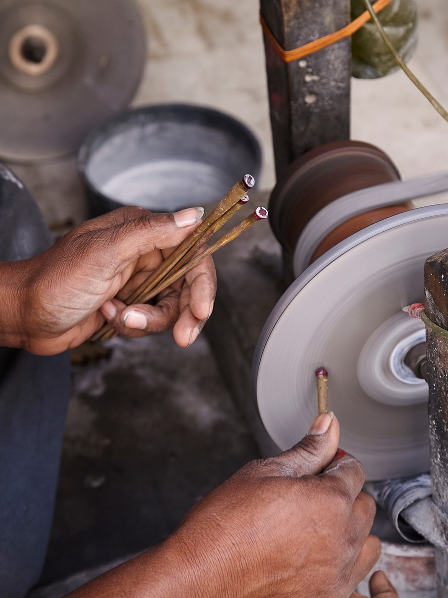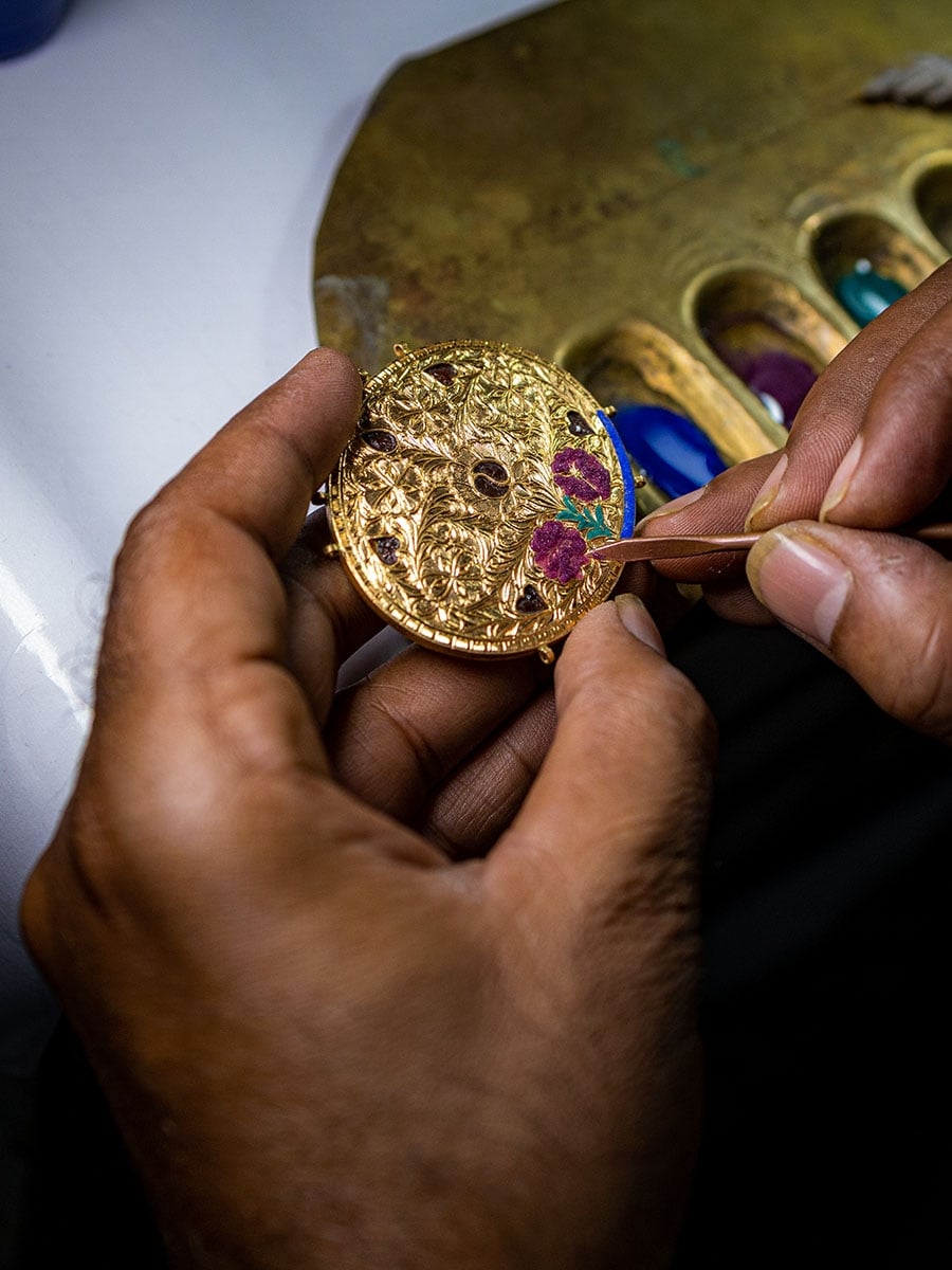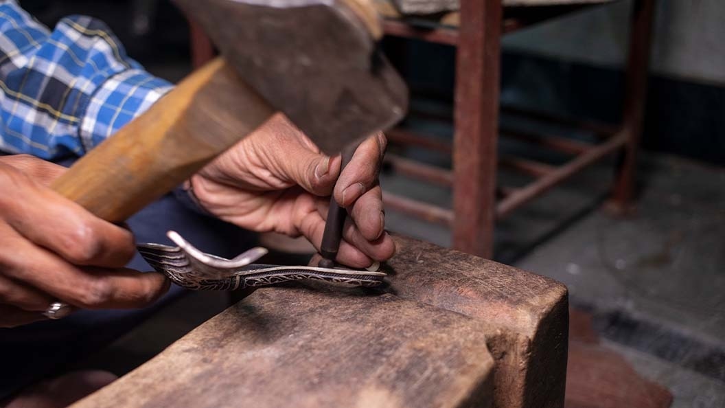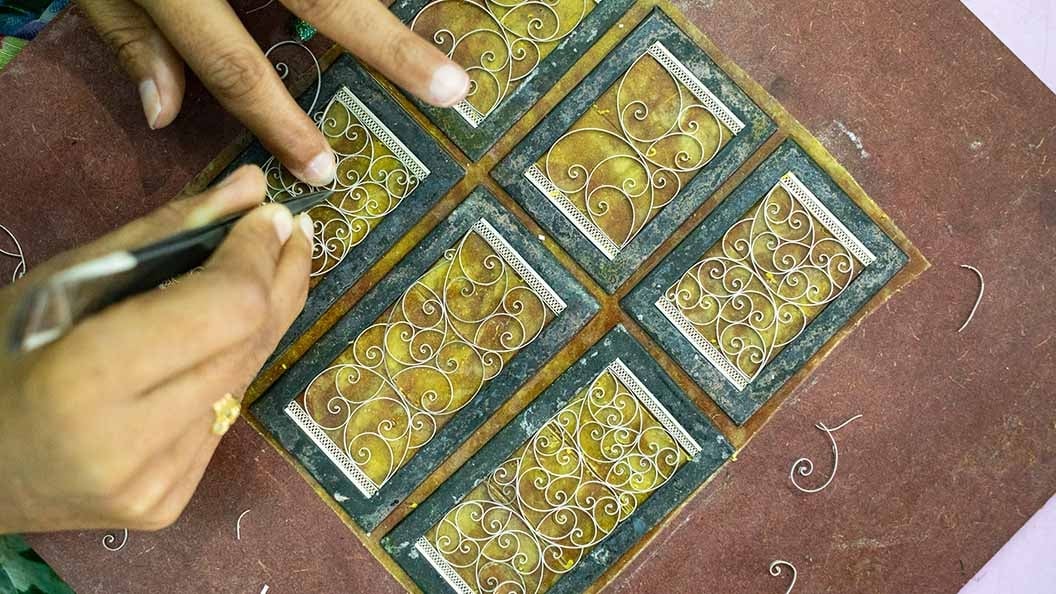 The artisans first draw delicate hair-think wires out of blocks of silver using a wire-drawing machine. The wires are heated before being carefully wound around a charkha (spinning wheel). After the wires are flattened, they are arranged into intricate zigzag patterns. Fine threads of metal are curled, twisted and plaited, then joined with gold or silver soldering with a blowpipe. This craft has three distinct types: fine, non-fine, and superb. Each of these categories is further divided into silka (frame), rua (small balls) and gopal (rose).