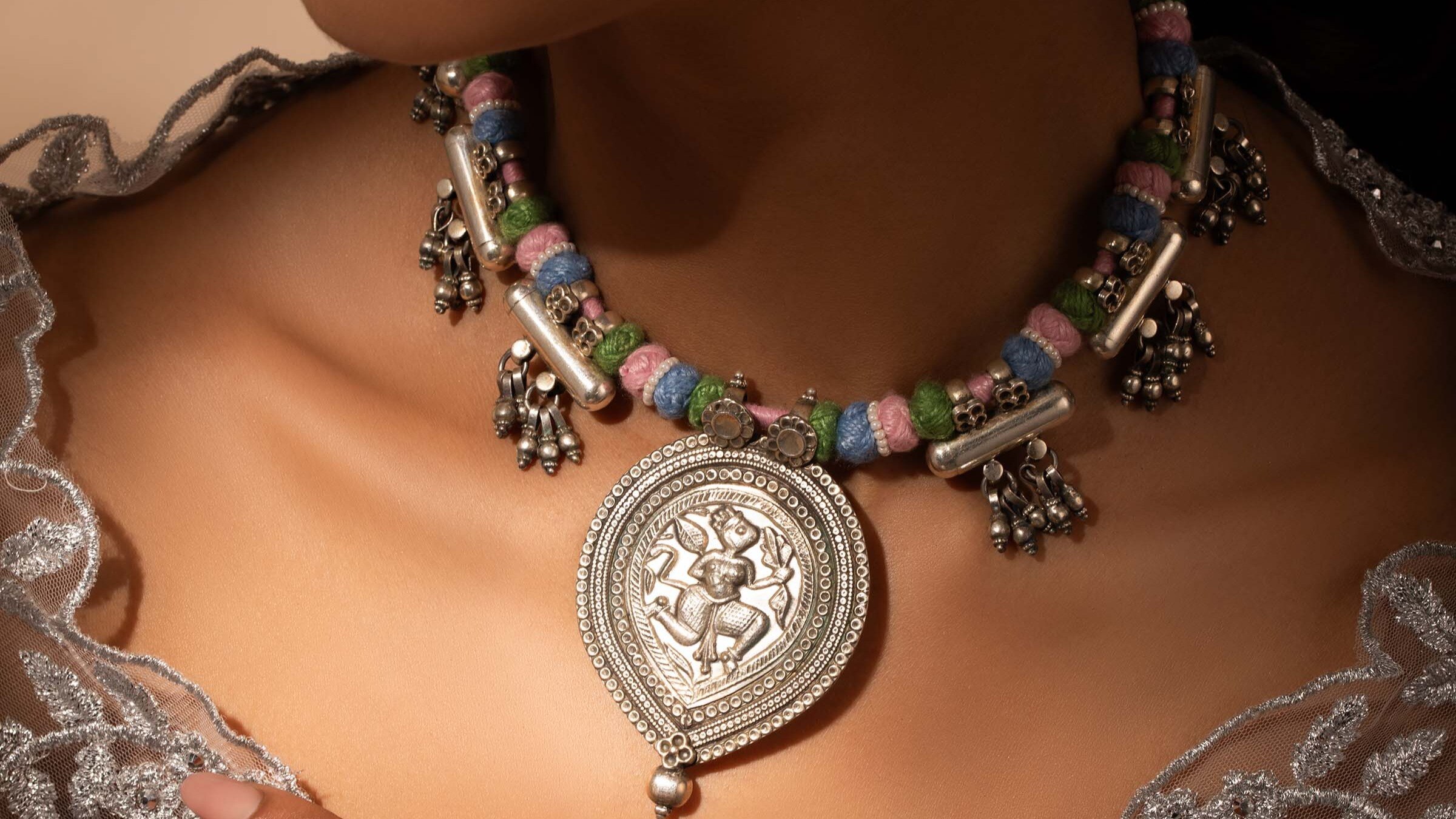 Crafted using time-honoured methods like repoussé, oxidation, and die-stamping, each necklace captures depth and contrast, creating pieces that gleam softly yet command attention. From choker forms echoing South Indian heritage to elongated chains inspired by Mughal filigree, silver necklaces represent the meeting of history, spirituality, and artistry.