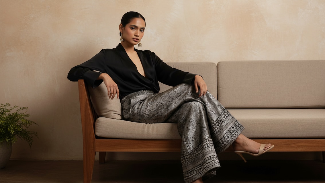 Showcasing Banaras brocade in striking contrast with luxurious, flowing silks in rich jewel tones. Elegant contemporary cocktail ensembles include coordinated sets, silk capes with brocade accents paired with wrap silken skirts, and asymmetrical kaftan-kurta sets teamed with chic pants. An effortlessly glamorous choice for stylish soirées and sophisticated dinner gatherings.