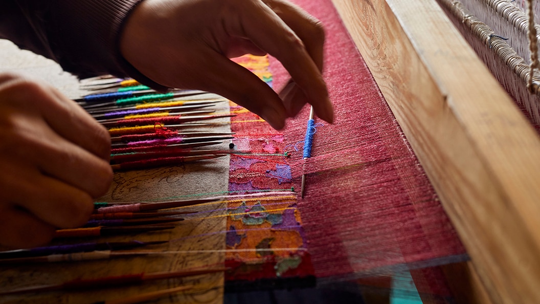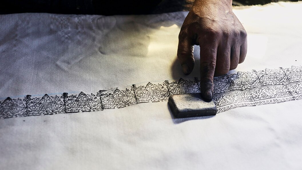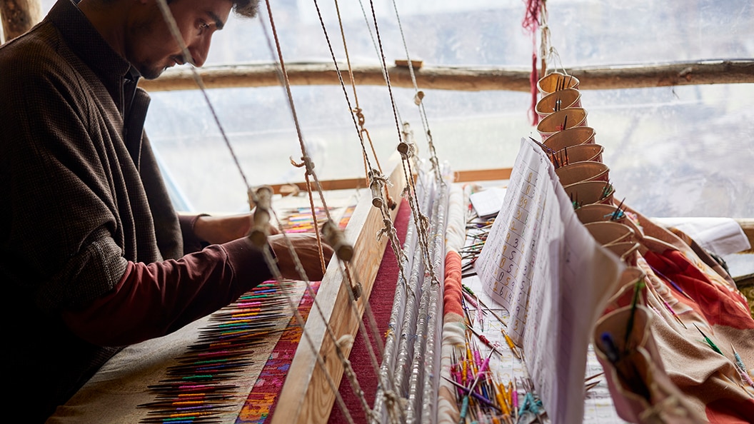 Once a design is conceptualised, a naqash (pattern maker) draws it onto graph paper using geometric techniques. Then, a wooden block (made of walnut wood), is immersed in chemical ink and carefully stamped over the shawl. The stamped shawl is then entrusted to a master artisan, who approves the design and selects colours for the embroidery.